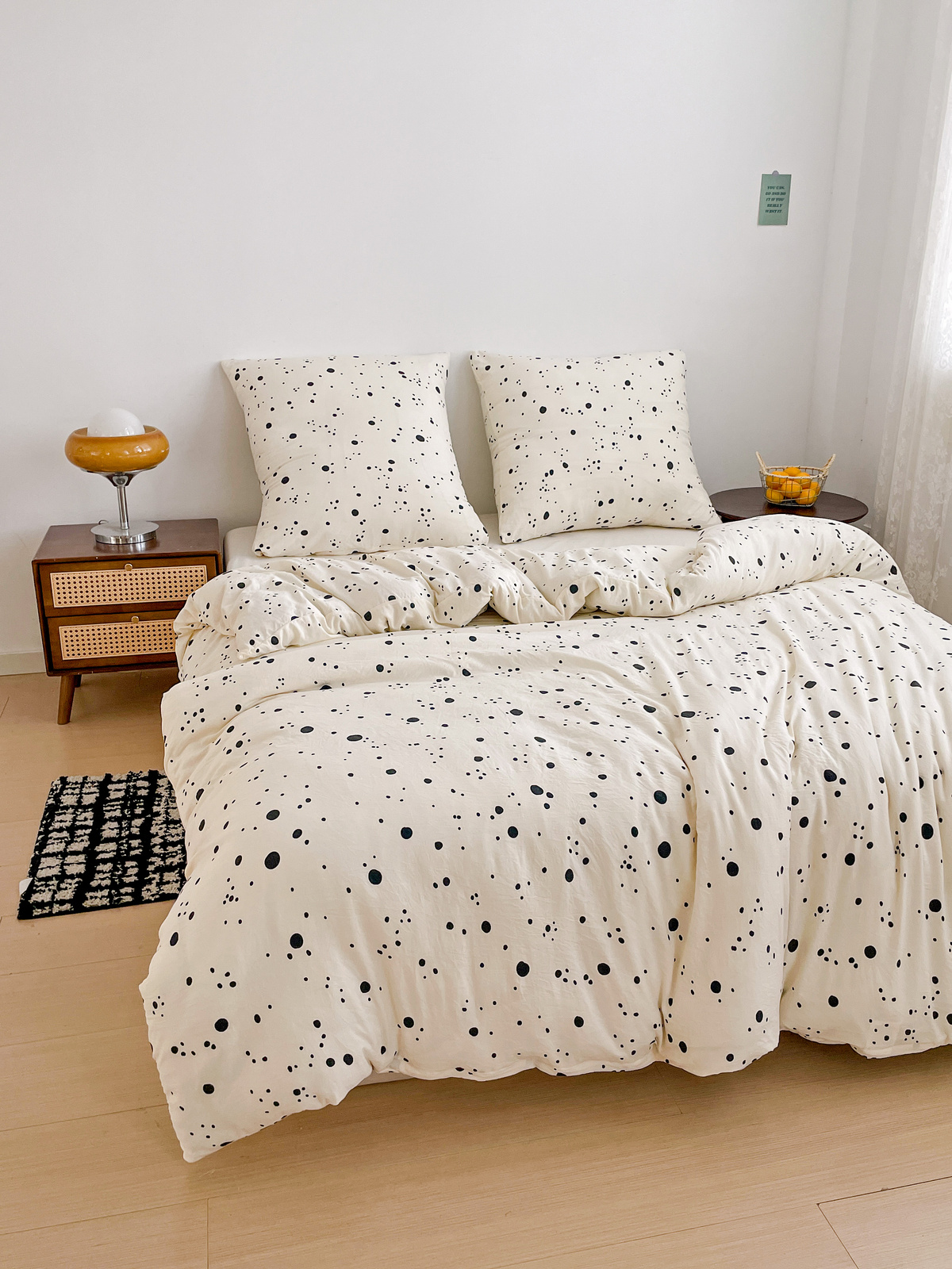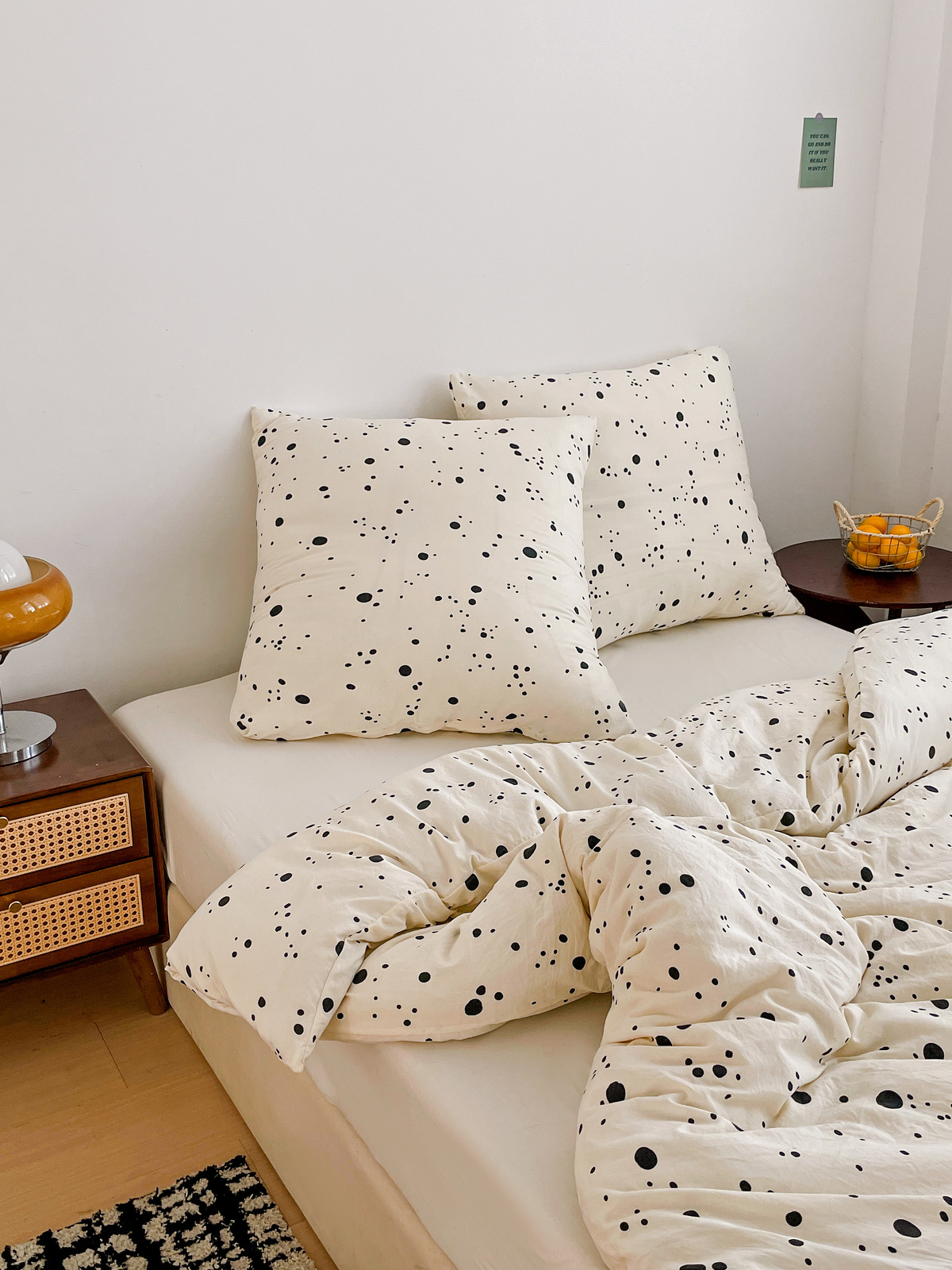 Połączenie ciepłego beżu z czarnymi kropeczkami sprawia, że pościel pasuje niemal do każdej aranżacji: boho, minimalistycznej, skandynawskiej czy klasycznej.