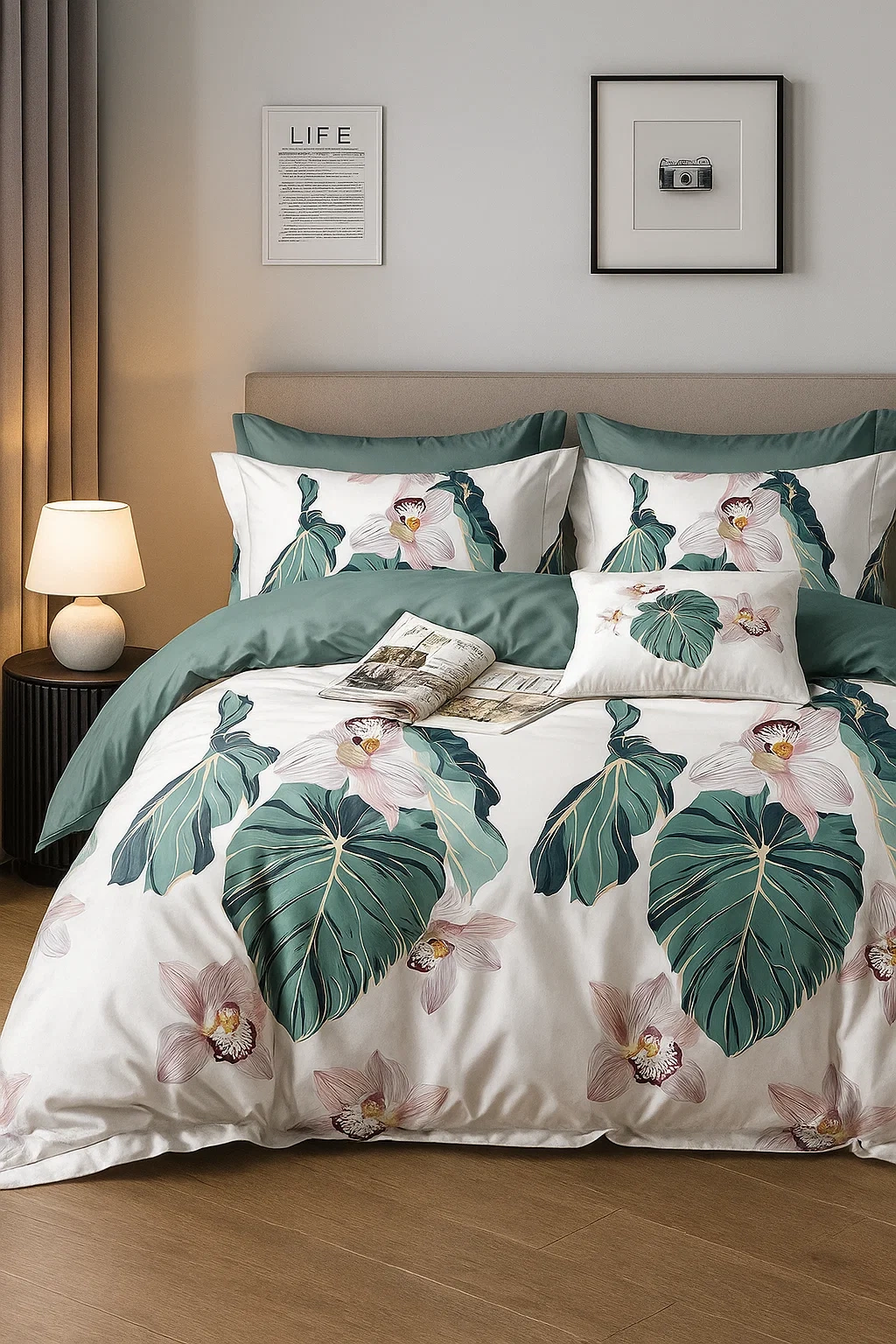 • Pościel w kwiaty, liście, biała, zielona, jasna szara