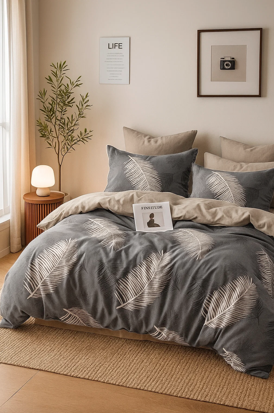 Pościel ciemna szara w piórka 160x200 4 el. z prześcieradłem z gumką Paraiso D-122