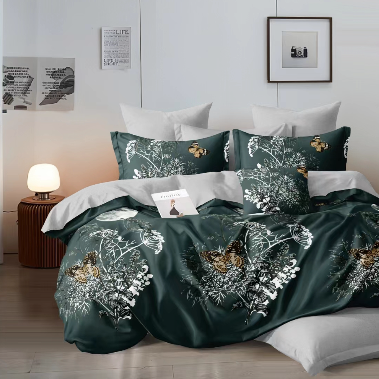 - Pościel w kwiaty, ciemna zielona, jasna szara