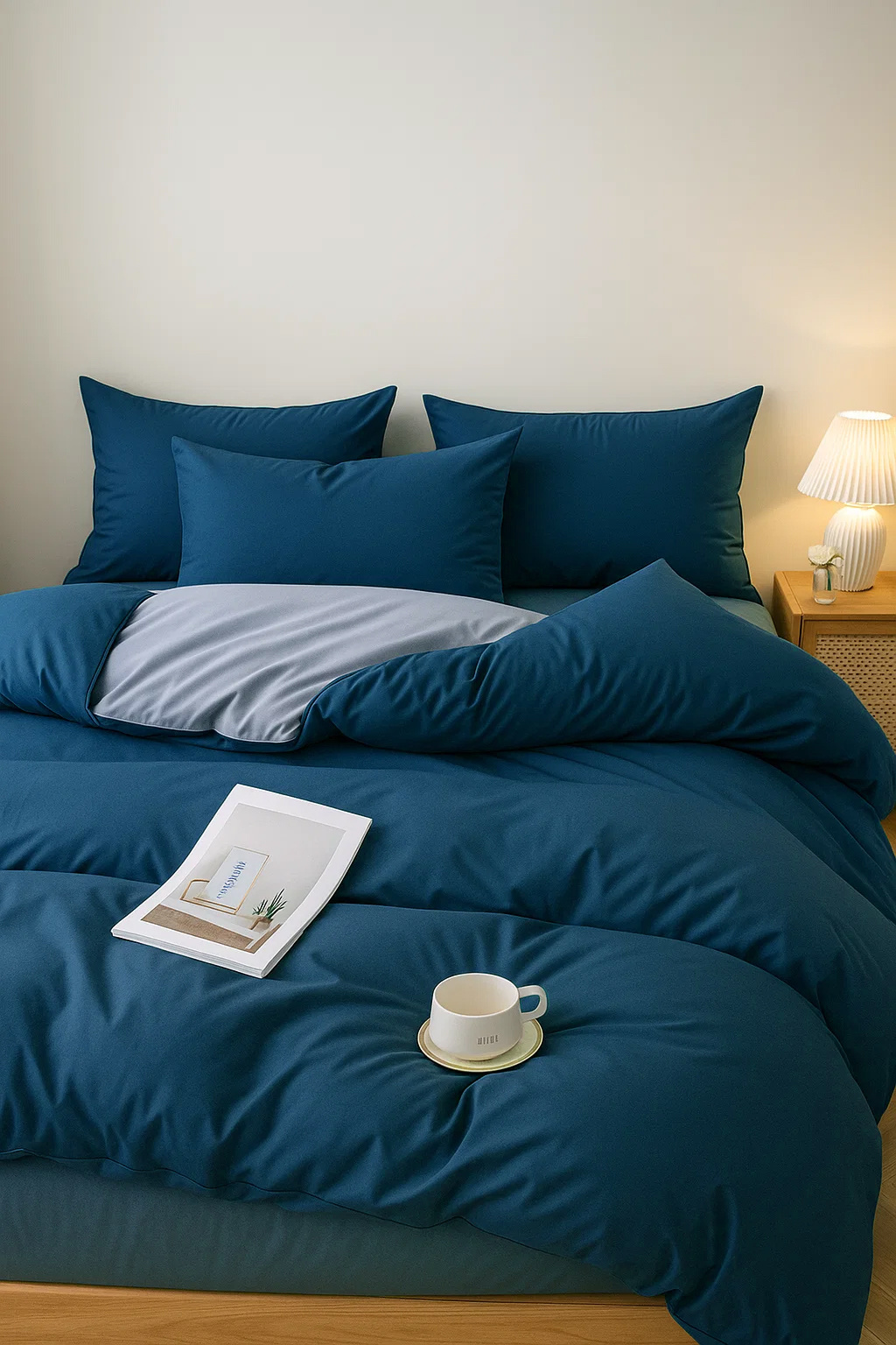 Pościel gładka dwukolorowa 200x220 4 el. z prześcieradłem z gumką niebieska - błękitna H11