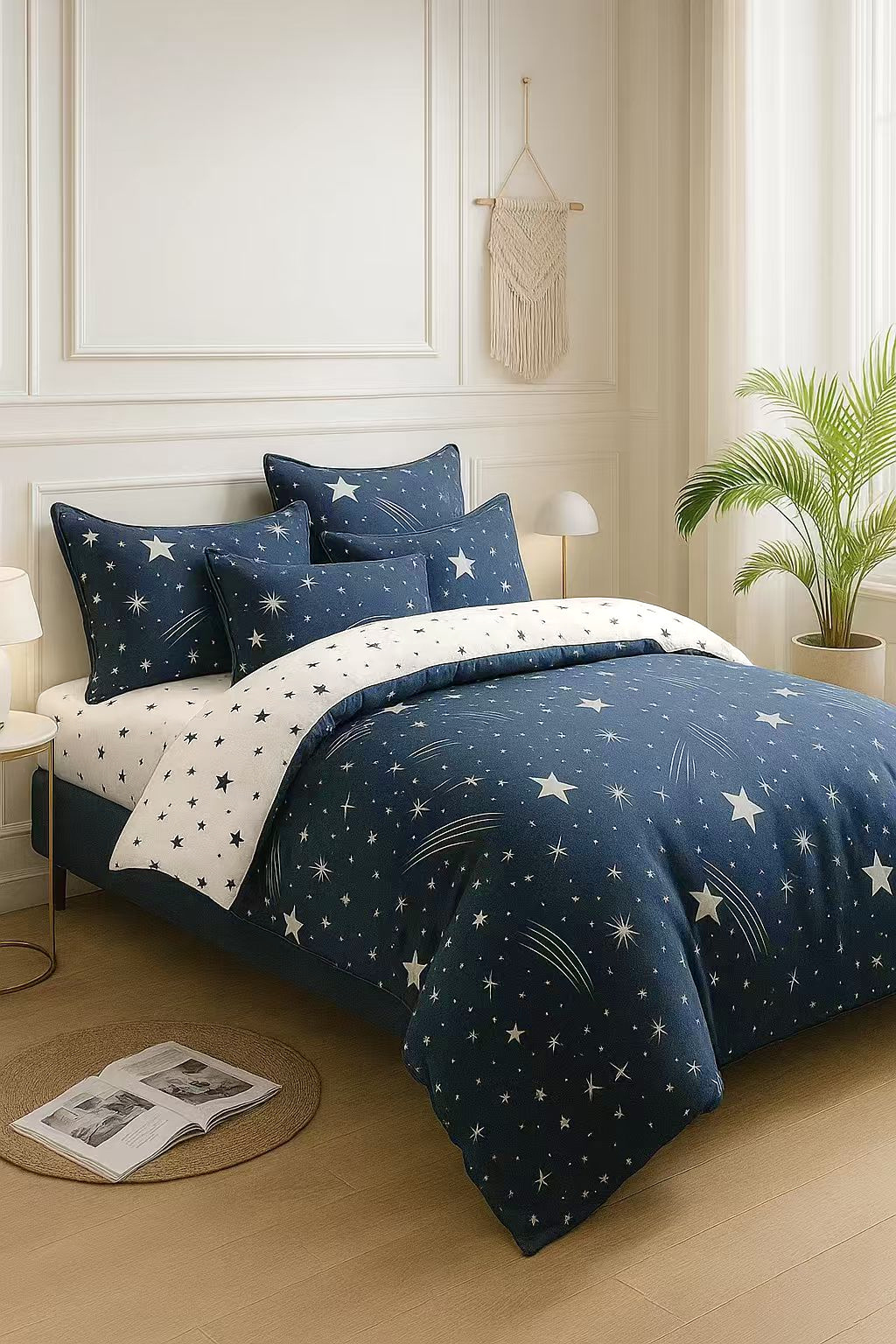 Pościel granatowa w gwiazdki 200x220 4 el. z prześcieradłem z gumką Night D-002