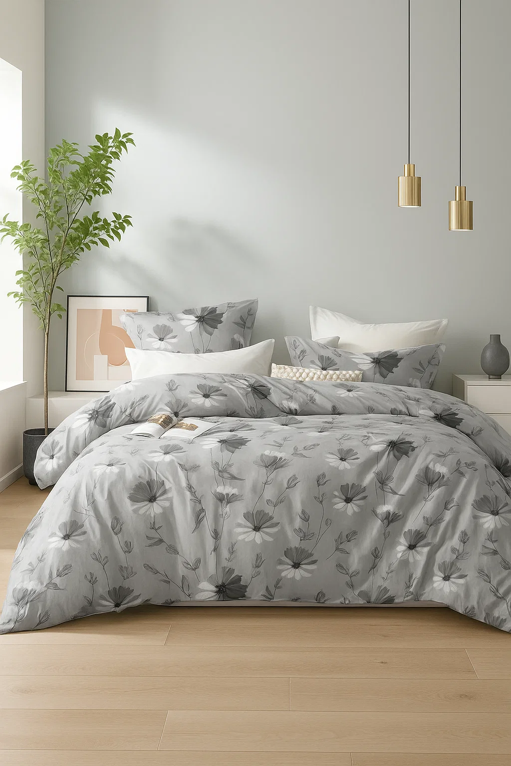 - Pościel w kwiaty, jasna szara