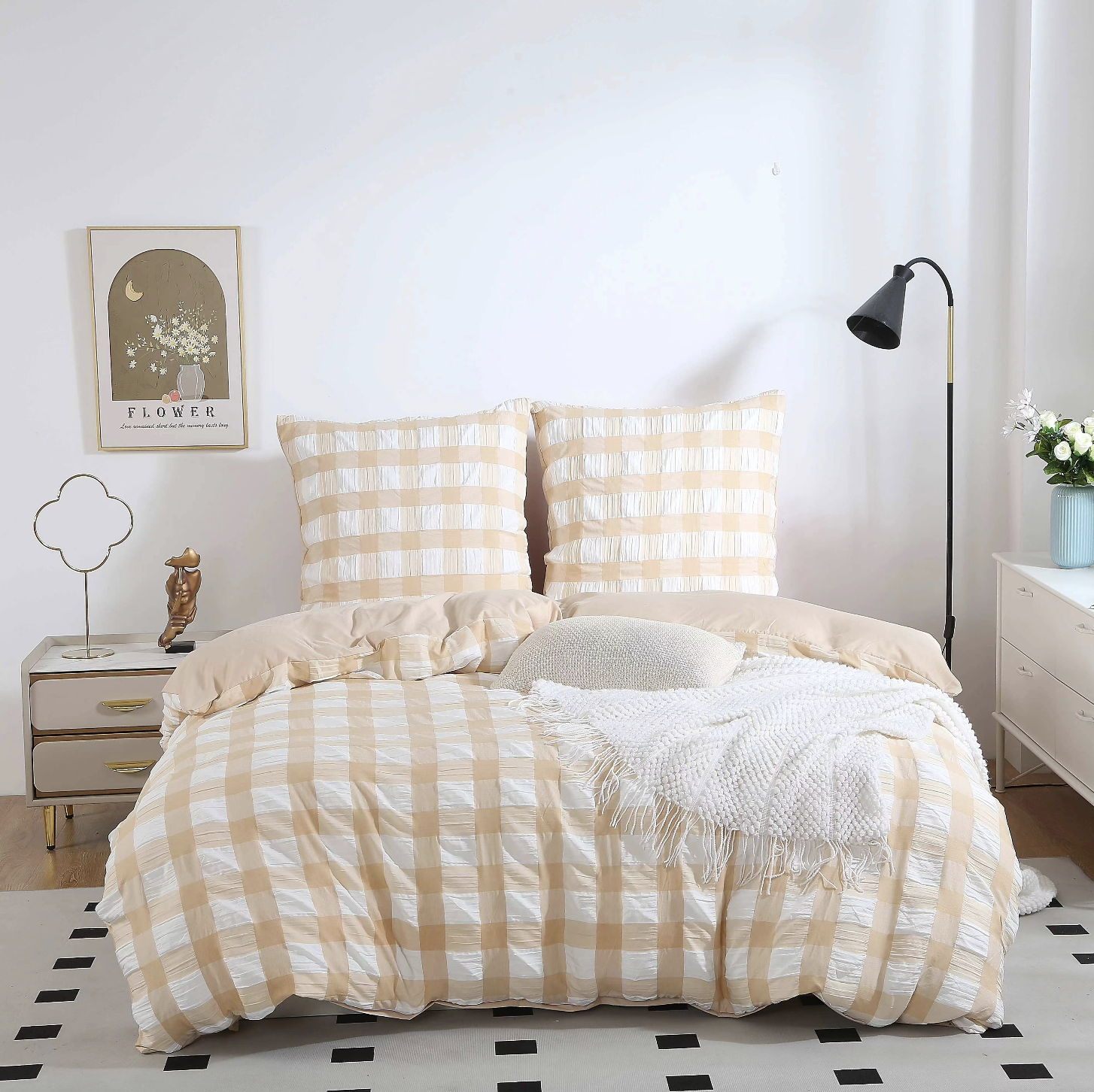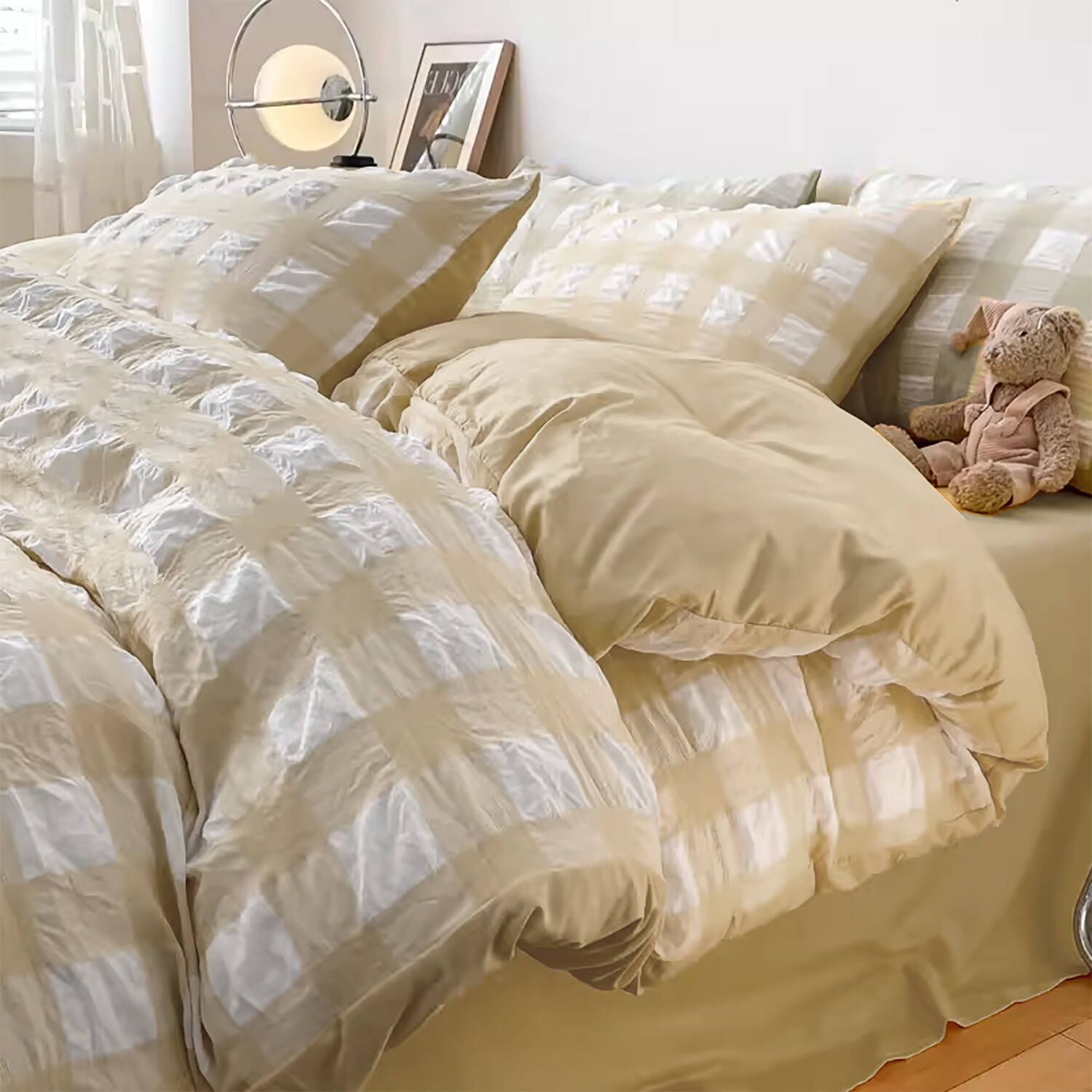 • Komplet beżowej pościeli z pięknym, ozdobnym tłoczeniem w kratkę. Najnowszy trend do Twojej sypialni.