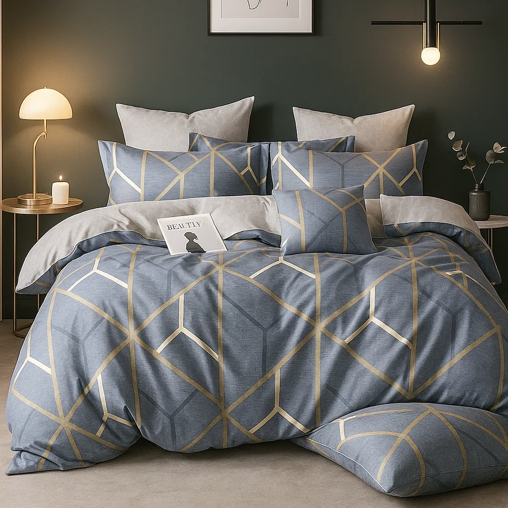 - Pościel geometryczna, dwukolorowa, niebieska, jasna szara