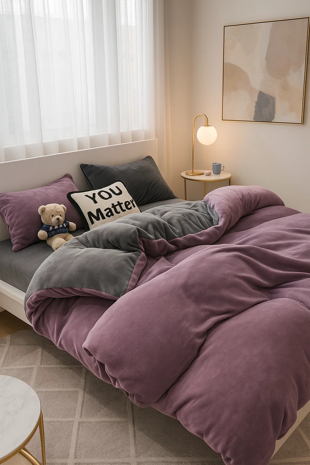 - Komplet pościeli ciepłej zimowej z pluszu, 160x200 polarowa, dwustronna poszewka na kołdrę i 2 x poszewka na poduszkę 70x80, pościel gładka, bez wzoru, dwukolorowa, fioletowa, ciemna szara