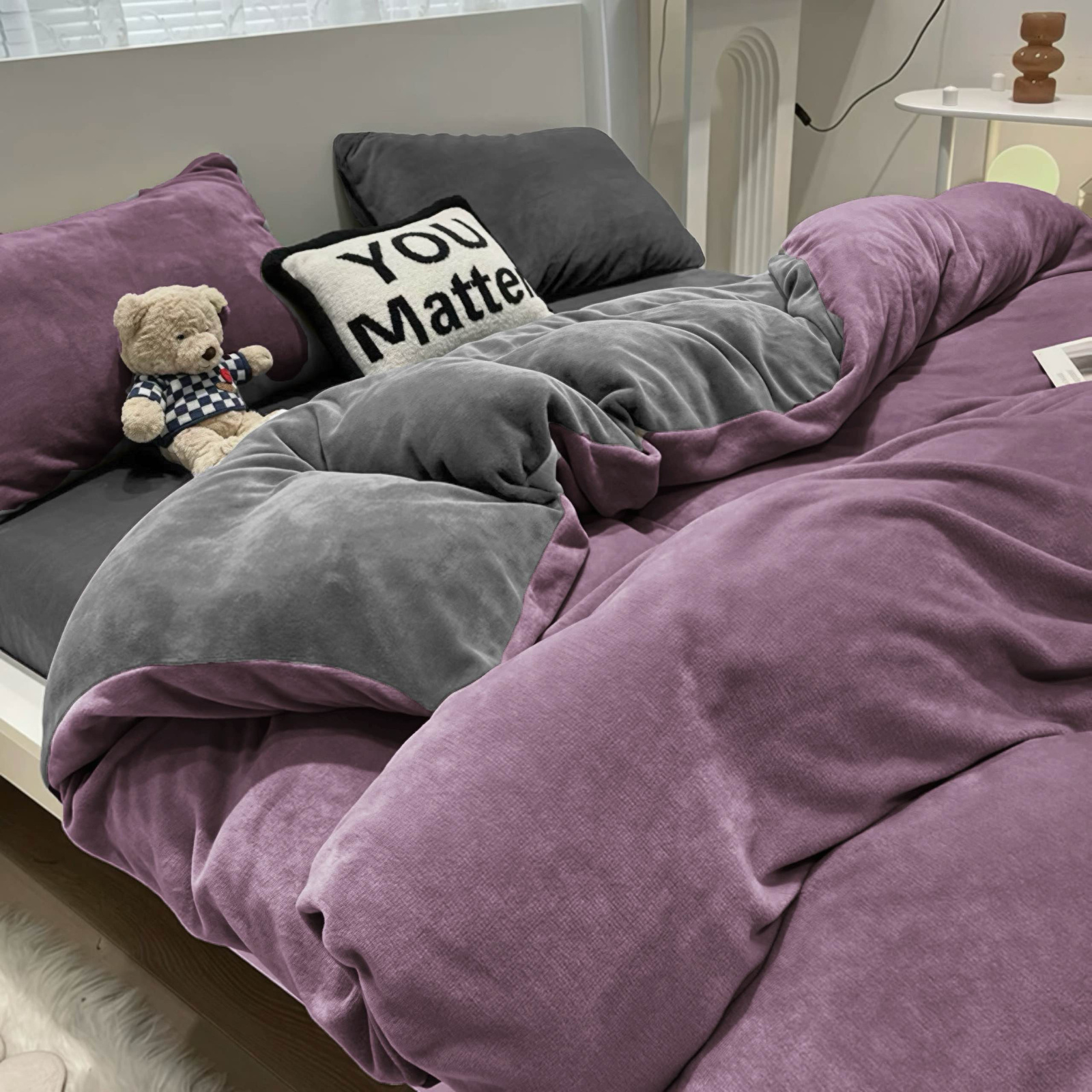 - Komplet pościeli ciepłej zimowej z pluszu, 160x200 polarowa, dwustronna poszewka na kołdrę i 2 x poszewka na poduszkę 70x80, prześcieradło 160x200 z gumką, pościel gładka, bez wzoru, dwukolorowa, fioletowa, ciemna szara