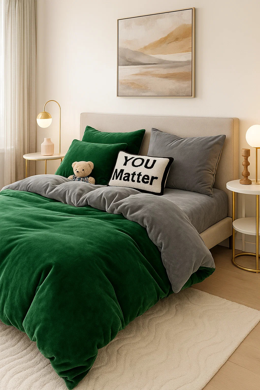 Pościel pluszowa welurowa zimowa miś gładka 200x220 3 el. butelkowa zielona - szara