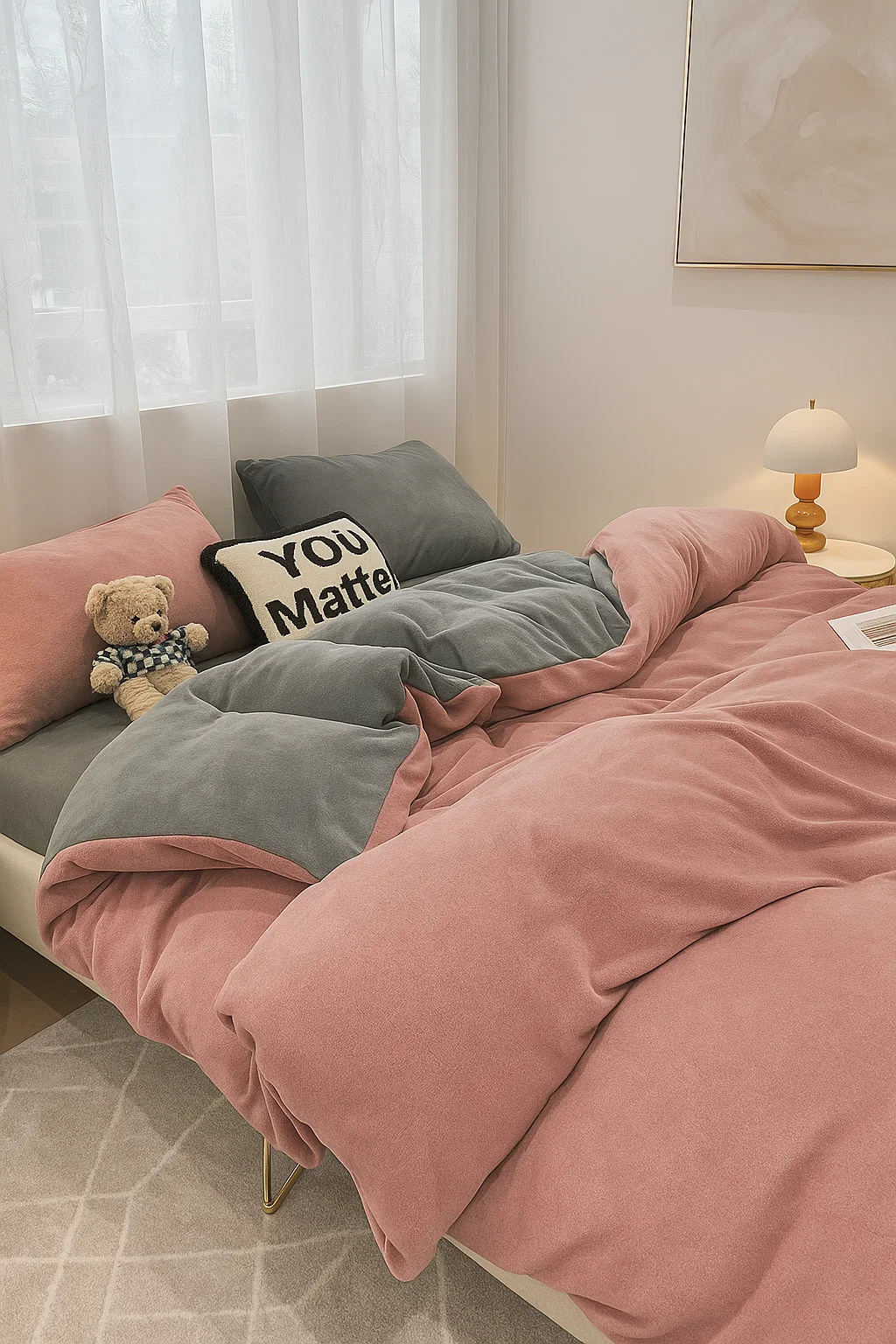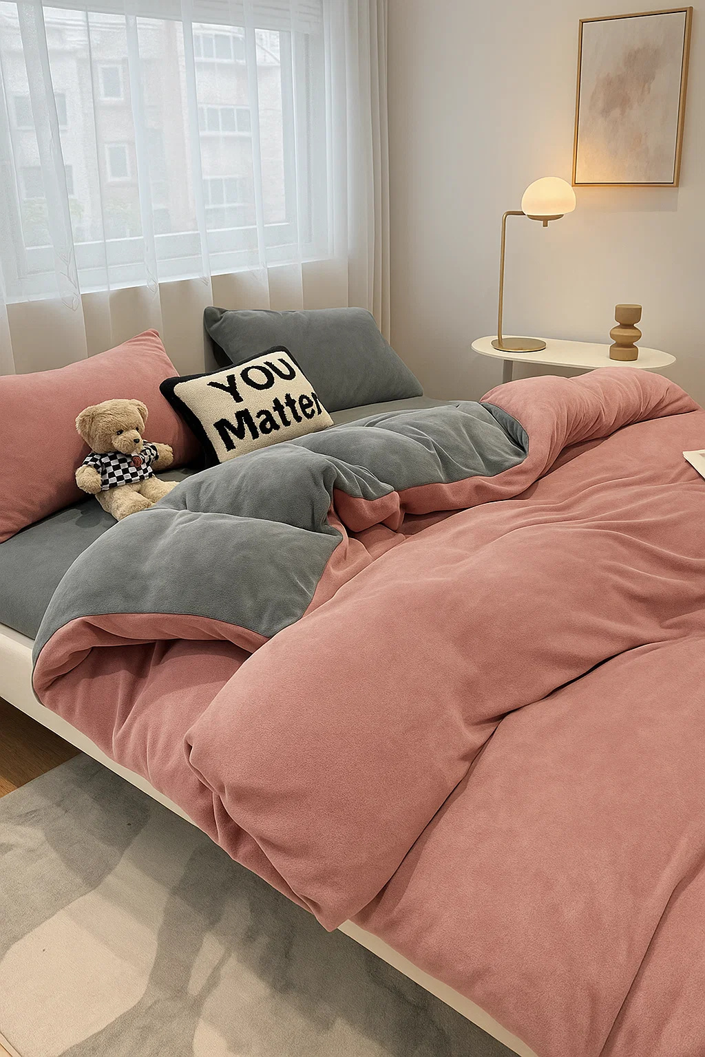- Komplet pościeli ciepłej zimowej z pluszu, 200x220 polarowa, dwustronna poszewka na kołdrę i 2 x poszewka na poduszkę 70x80, pościel gładka, bez wzoru, dwukolorowa, różowa, ciemna szara