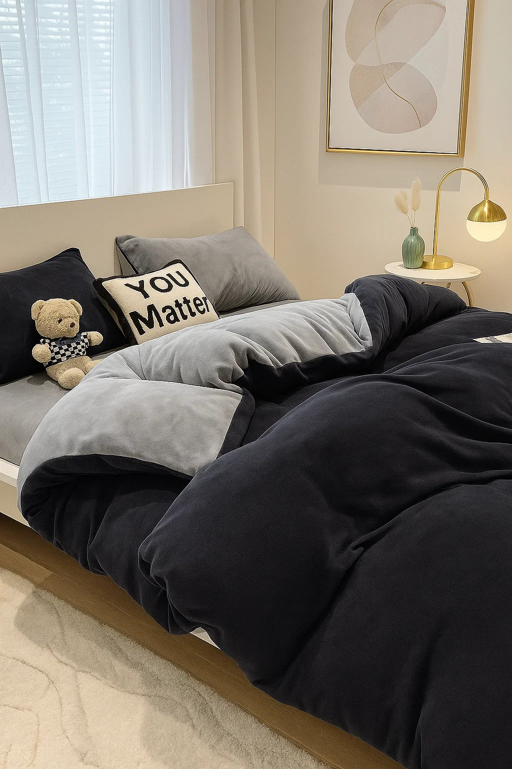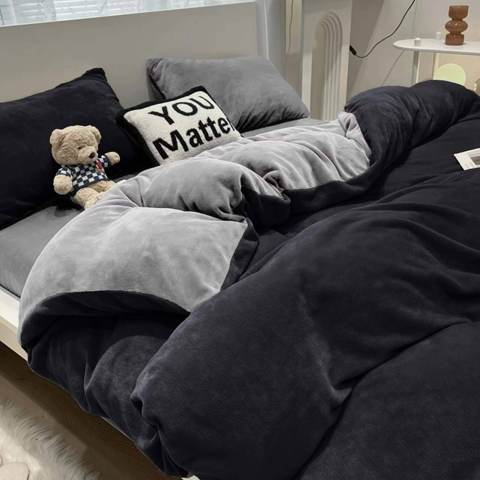 - Komplet pościeli ciepłej zimowej z pluszu, polarowa 200x220, dwustronna poszewka na kołdrę i 2 x poszewka na poduszkę 70x80, prześcieradło 200x220 z gumką, pościel gładka, bez wzoru, dwukolorowa, czarna, szara