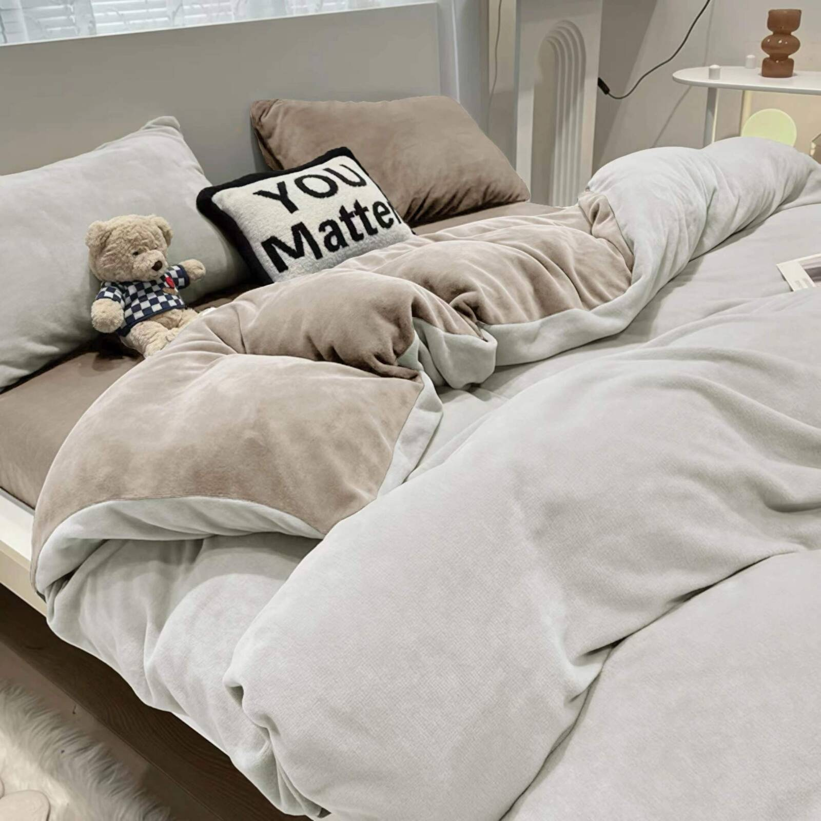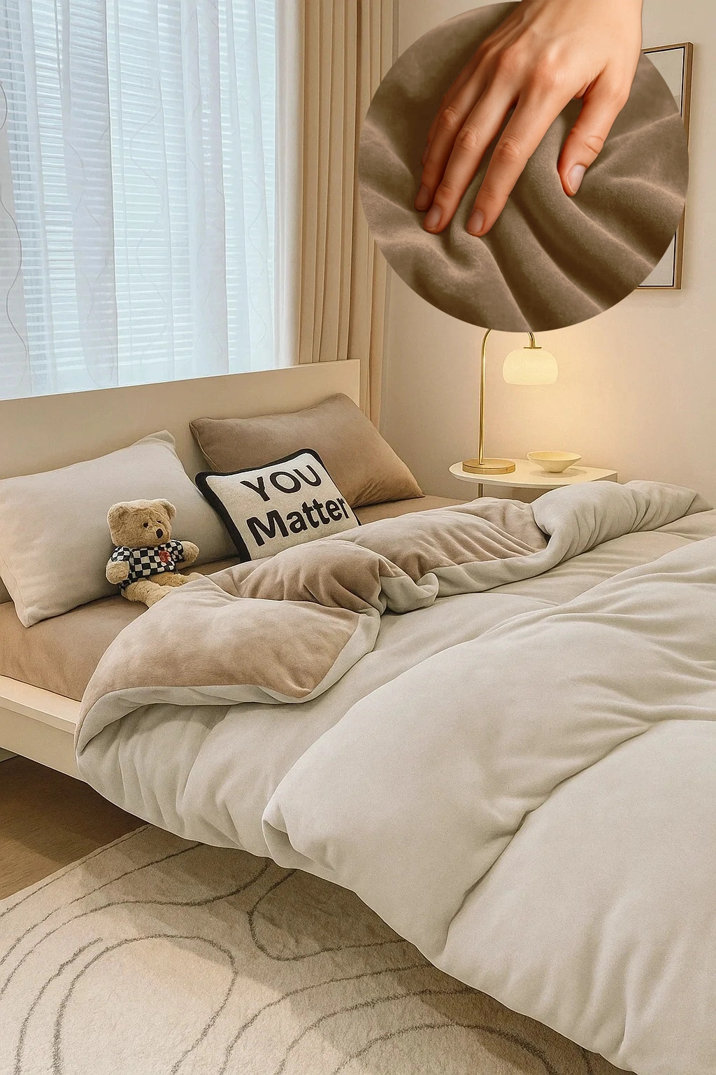 • Komplet pościeli ciepłej zimowej z pluszu, polarowa 200x220, dwustronna poszewka na kołdrę i 2 x poszewka na poduszkę 70x80, prześcieradło 200x220 z gumką, pościel gładka, bez wzoru, dwukolorowa, beżowa, kremowa