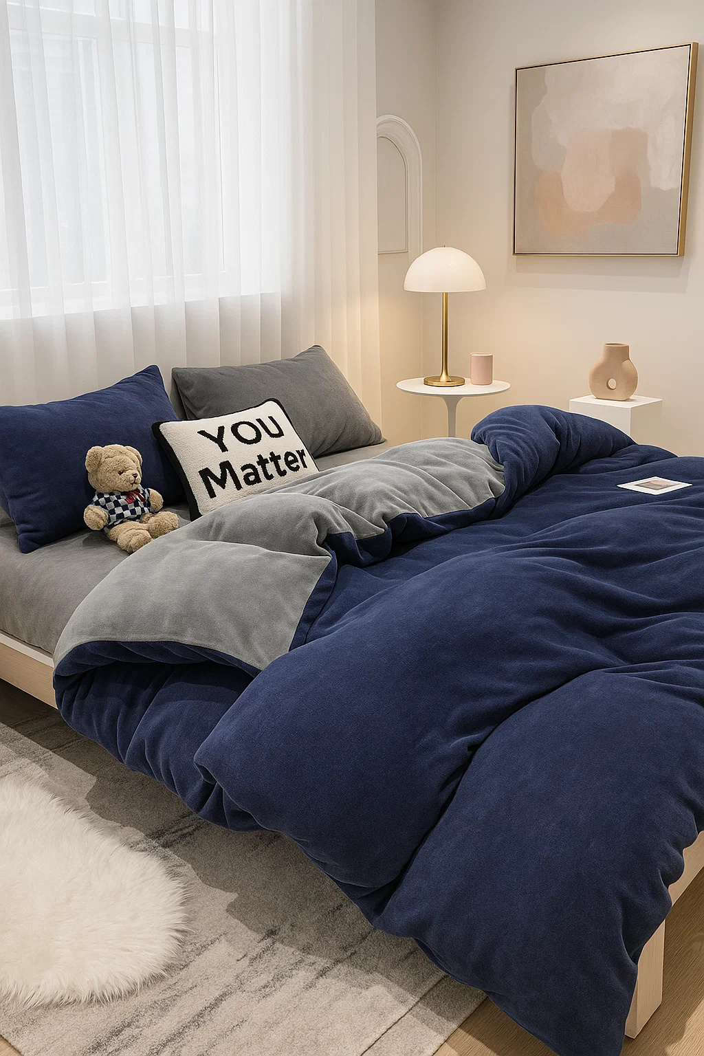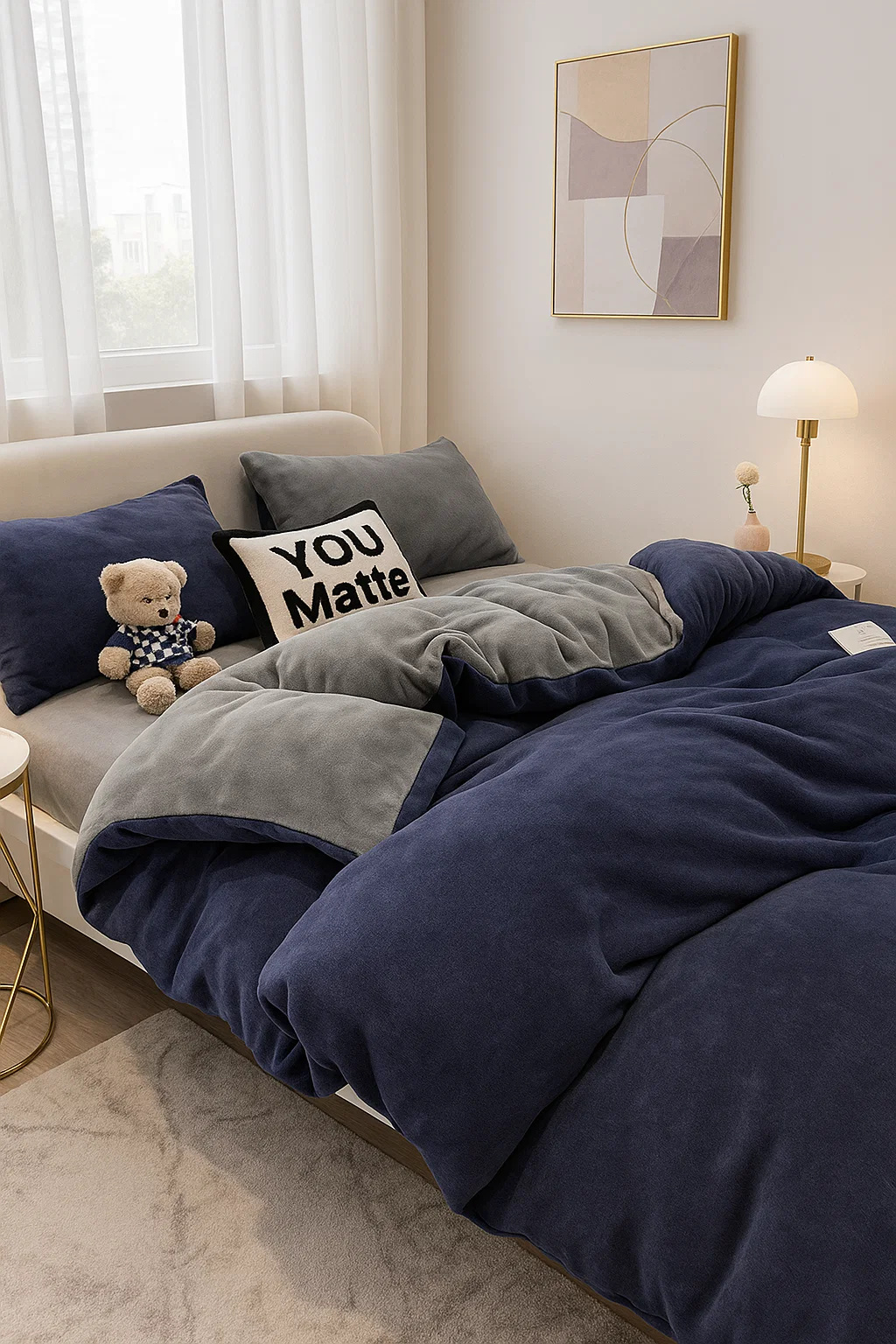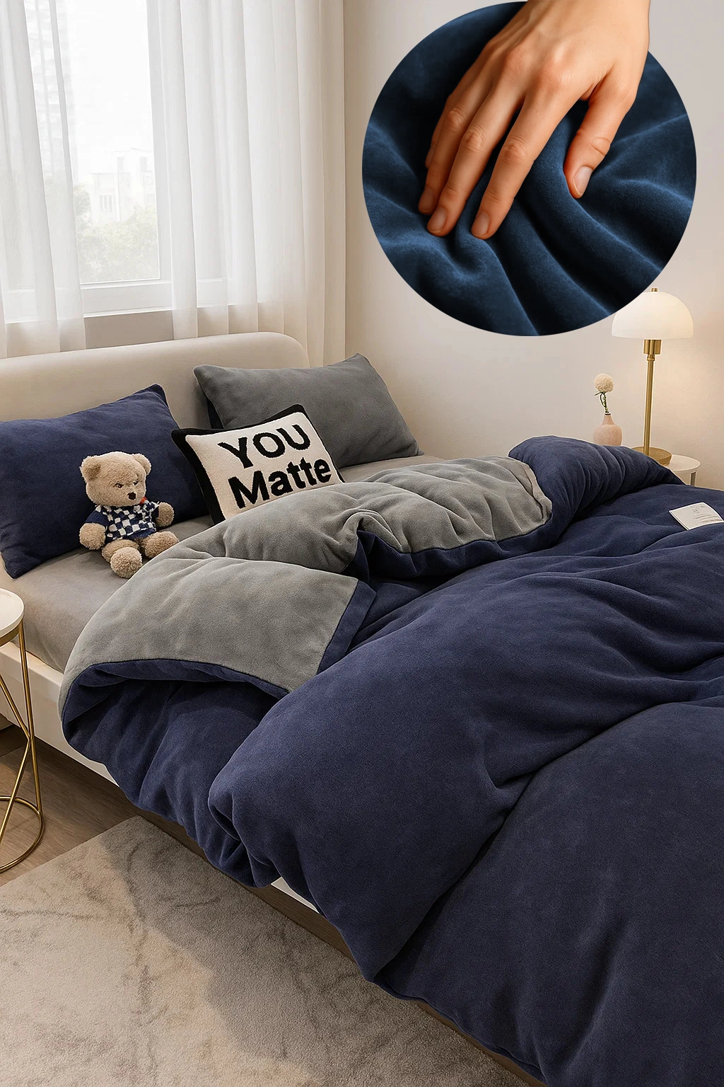 - Komplet pościeli ciepłej zimowej z pluszu, polarowa 200x220, dwustronna poszewka na kołdrę i 2 x poszewka na poduszkę 70x80, prześcieradło 200x220 z gumką, pościel gładka, bez wzoru, dwukolorowa, niebieska, szara