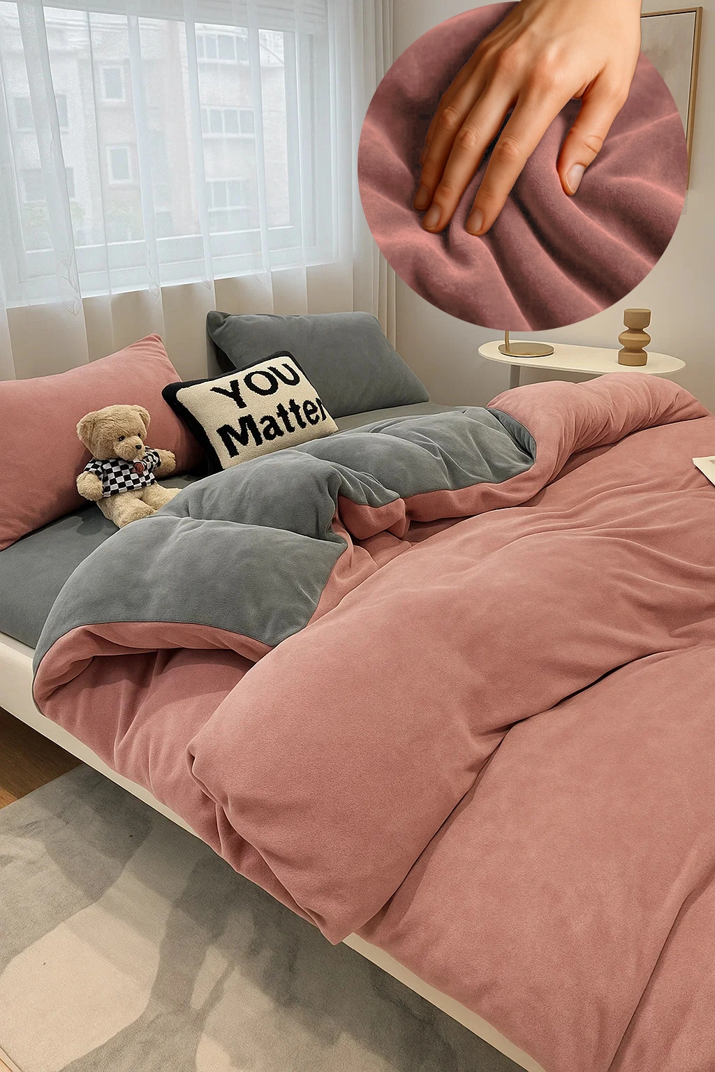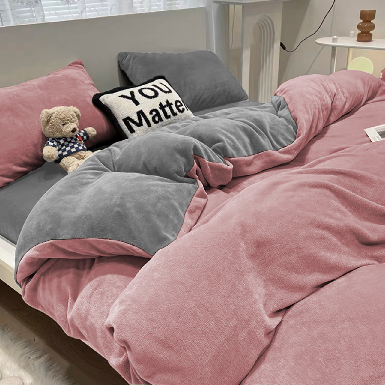 • Komplet pościeli ciepłej zimowej z pluszu, polarowa 200x220, dwustronna poszewka na kołdrę i 2 x poszewka na poduszkę 70x80, prześcieradło 200x220 z gumką, pościel gładka, bez wzoru, dwukolorowa, różowa, szara