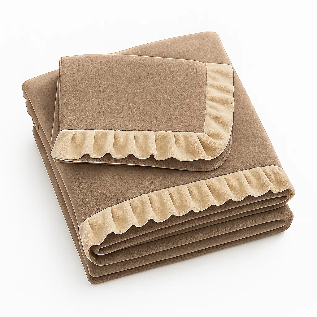 - Komplet pościeli ciepłej zimowej z pluszu, 160x200 polarowa, dwustronna poszewka na kołdrę i 2 x poszewka na poduszkę 70x80, pościel z falbanką, dwukolorowa, jasna beżowa, ciemna beżowa