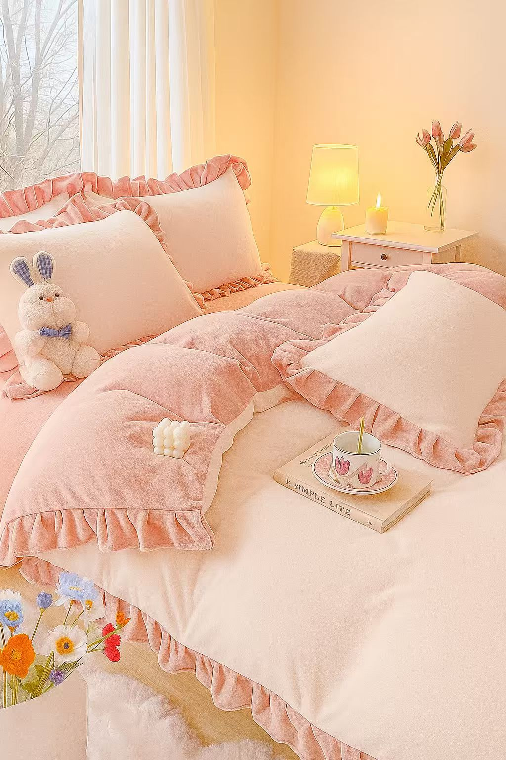 - Komplet pościeli ciepłej zimowej z pluszu, polarowa 160x200, dwustronna poszewka na kołdrę i 2 x poszewka na poduszkę 70x80, pościel z falbanką, dwukolorowa, jasna różowa