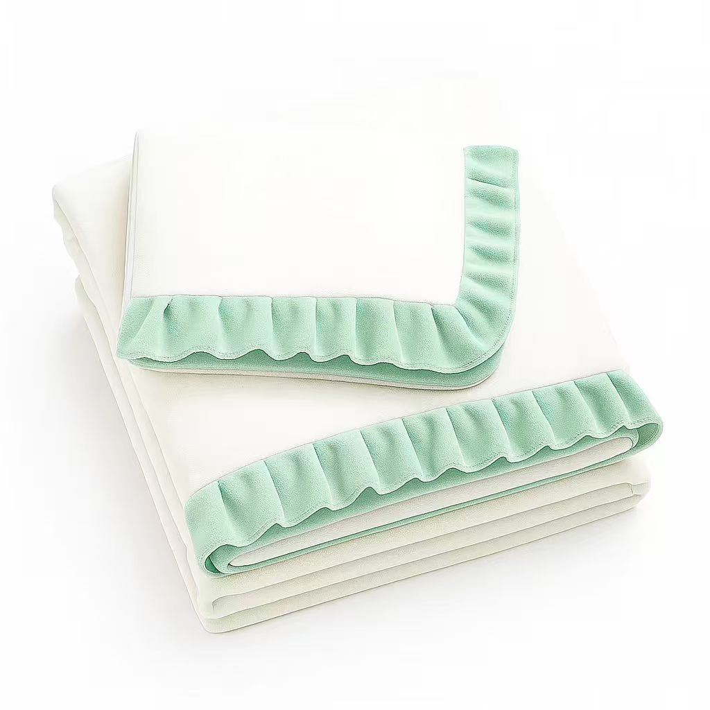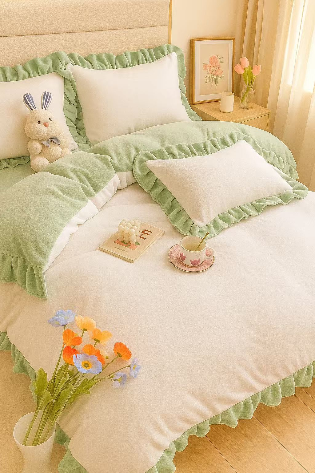 - Komplet pościeli ciepłej zimowej z pluszu, polarowa 200x220, dwustronna poszewka na kołdrę i 2 x poszewka na poduszkę 70x80, pościel z falbanką, dwukolorowa, biała, szałwiowa