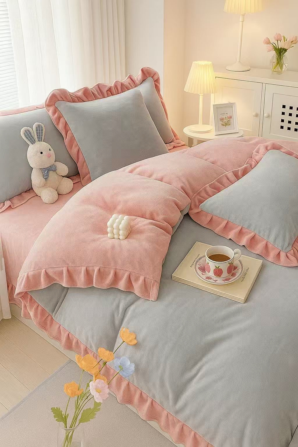 - Komplet pościeli ciepłej zimowej z pluszu, polarowa 200x220, dwustronna poszewka na kołdrę i 2 x poszewka na poduszkę 70x80, pościel z falbanką, dwukolorowa, jasna szara, różowa