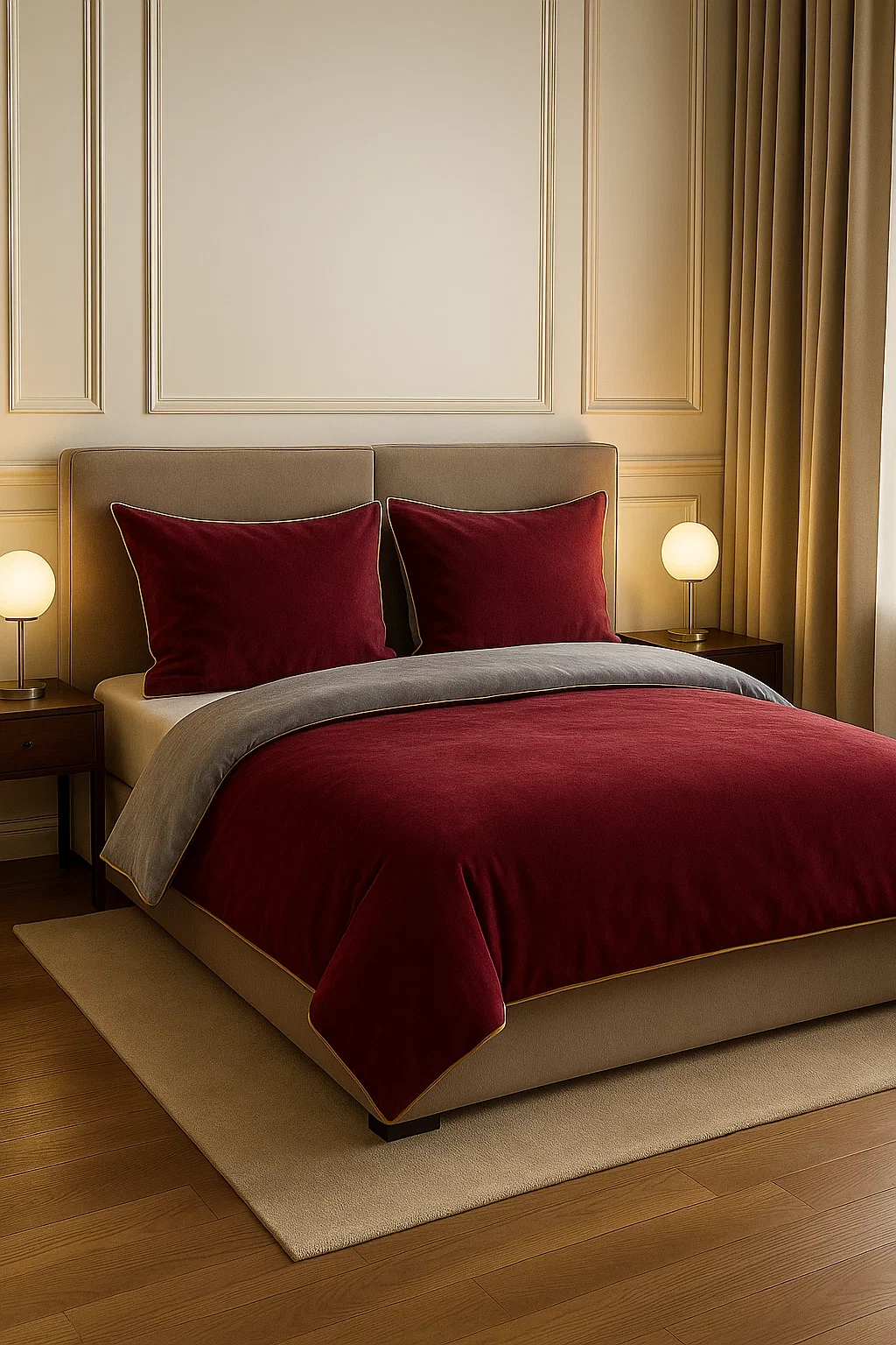 Bordo barwa i cienka złota lamówka dodają wnętrzu klasy, elegancji i nowoczesnego charakteru. To świetny wybór dla osób, które chcą, by ich sypialnia wyglądała estetycznie, luksusowo i przytulnie bez dużego wysiłku.