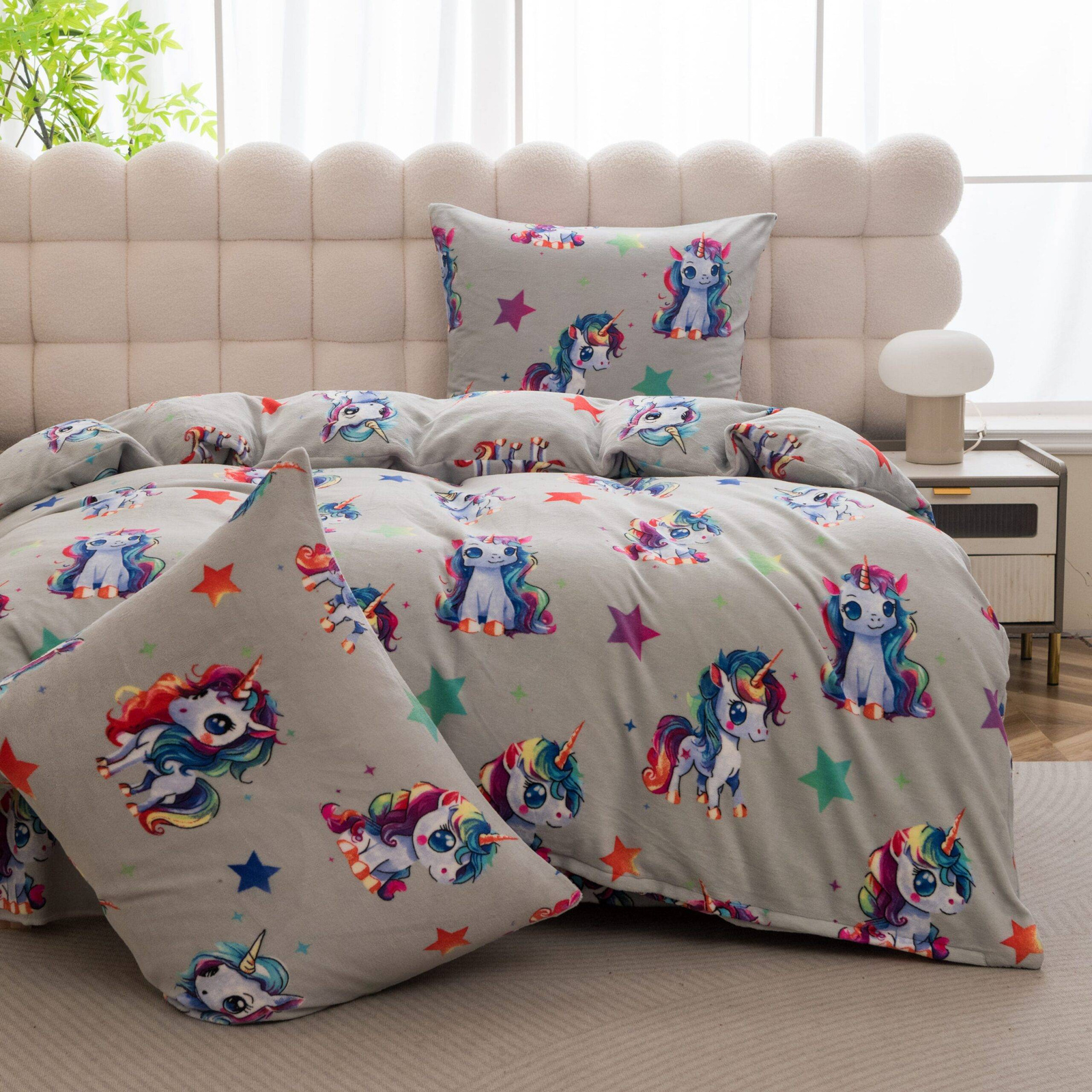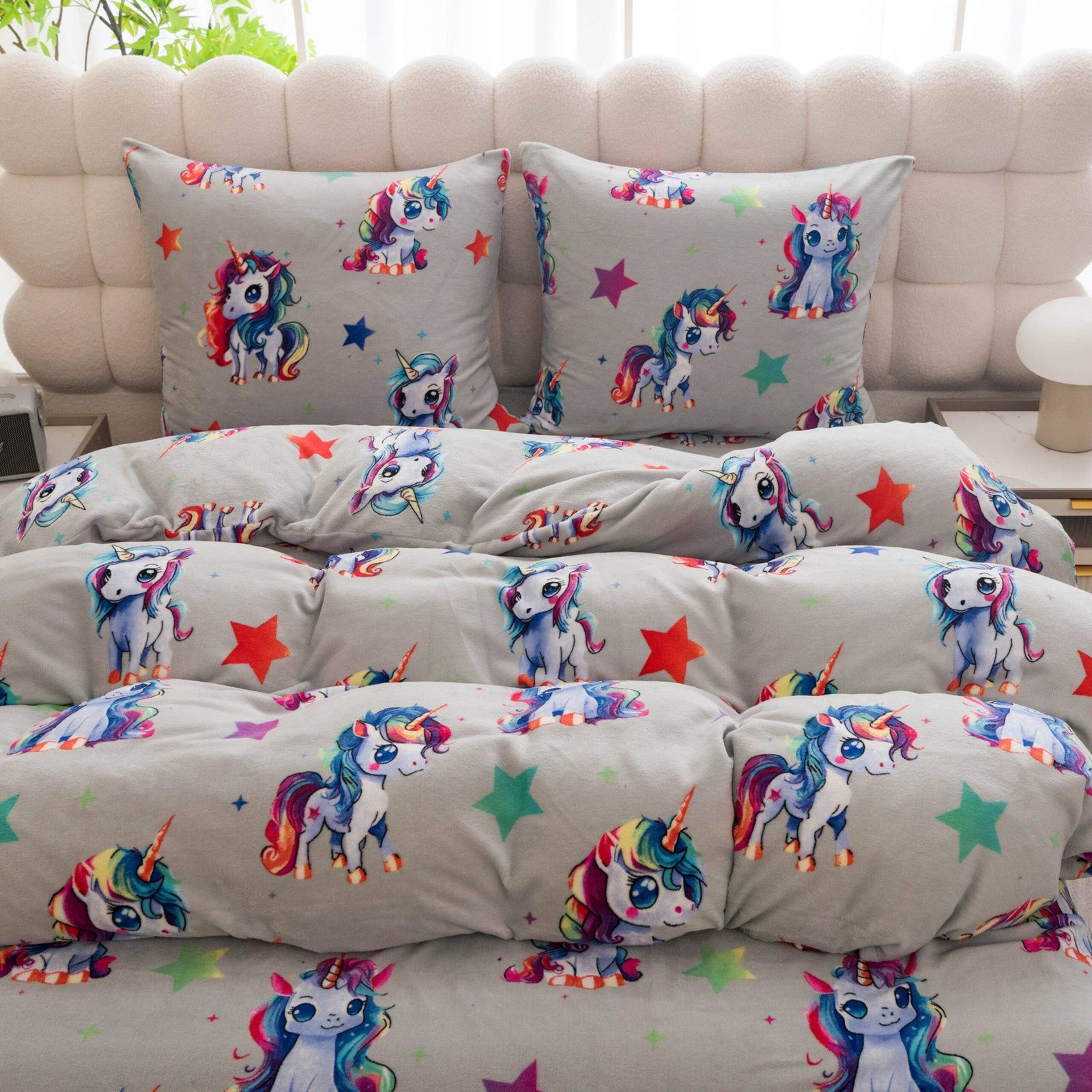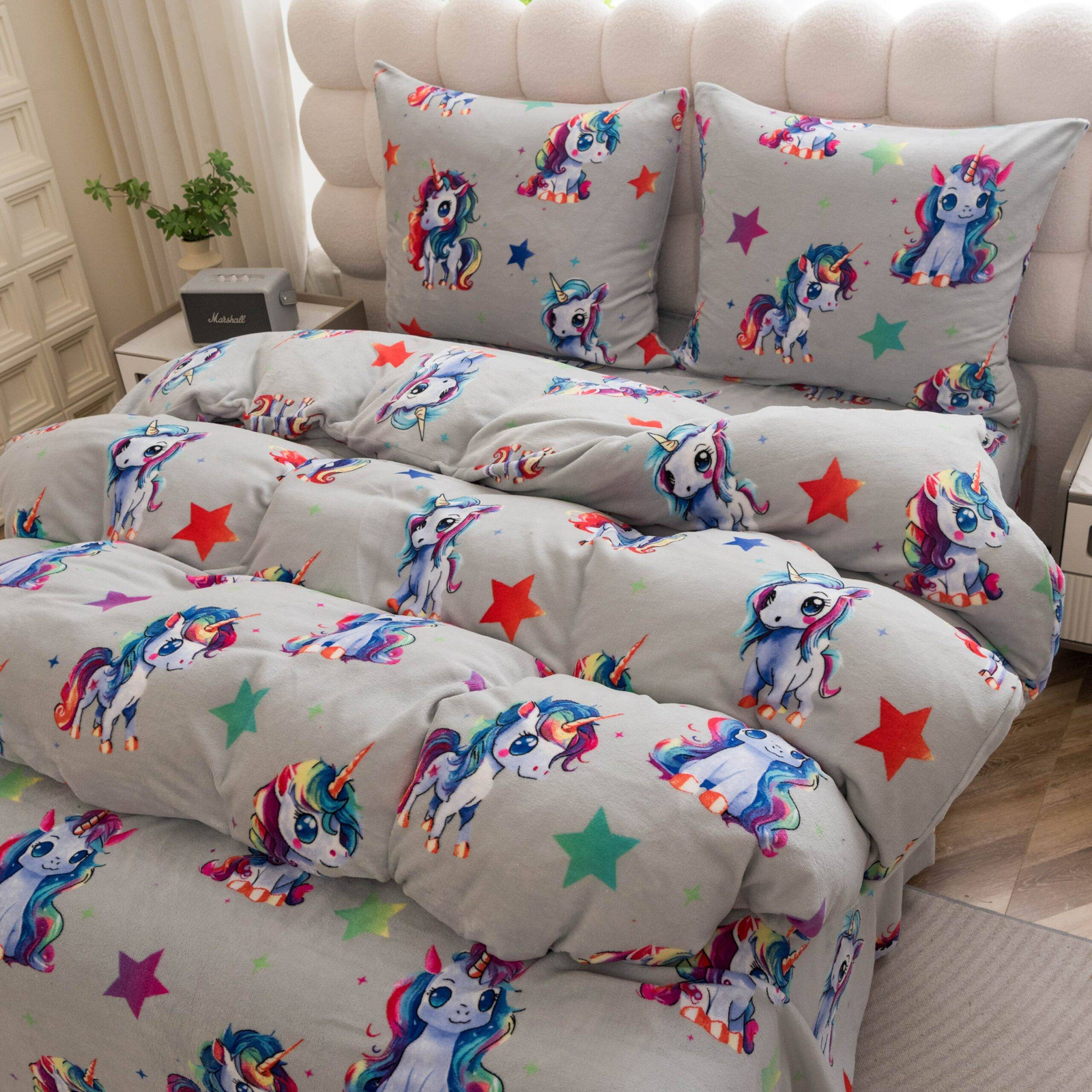 - Komplet pościeli ciepłej zimowej z pluszu, polarowa 160x200, dwustronna poszewka na kołdrę i 2 x poszewka na poduszkę 70x80, pościel w zwierzątka Unicorn, pościel dla dzieci, pościel dziecięca