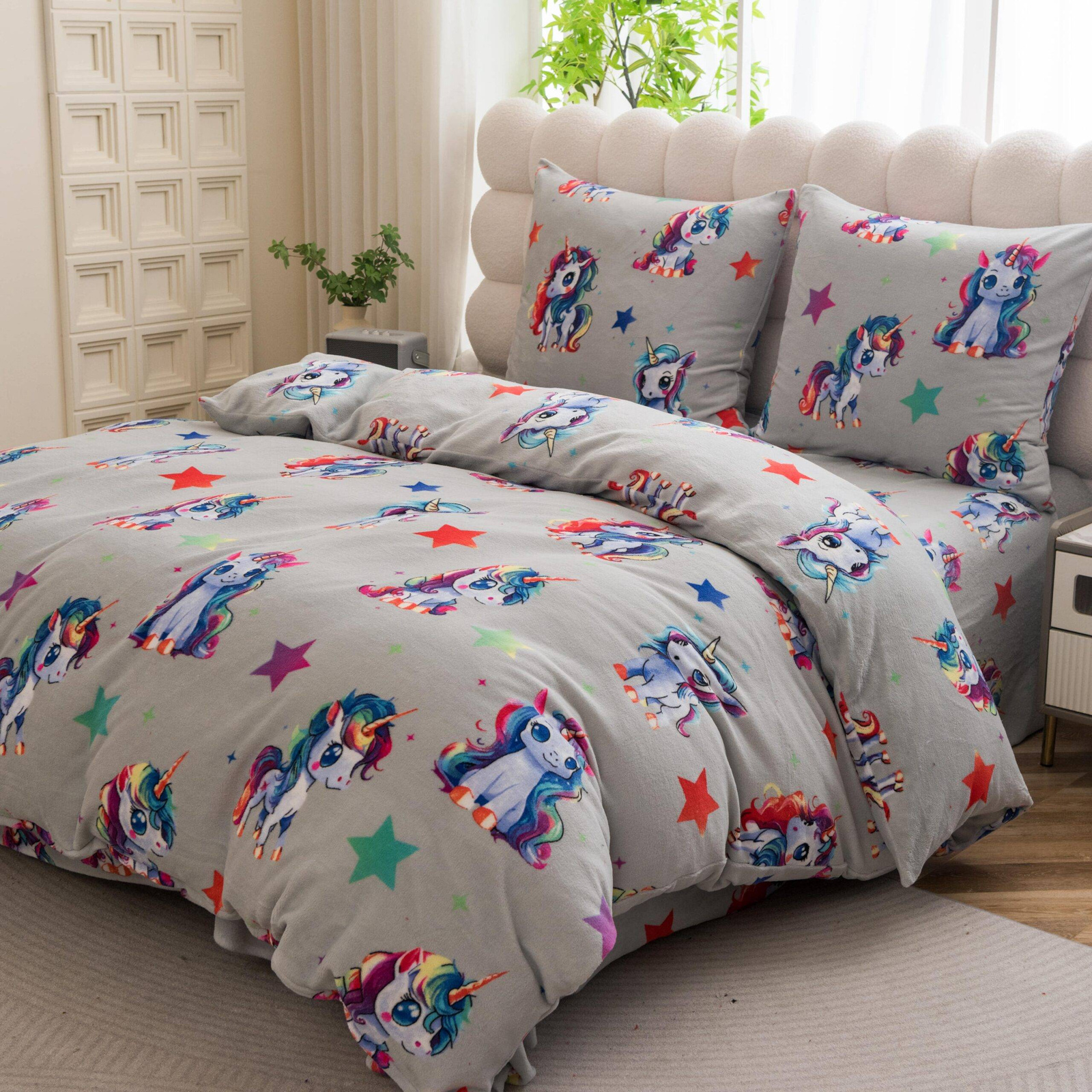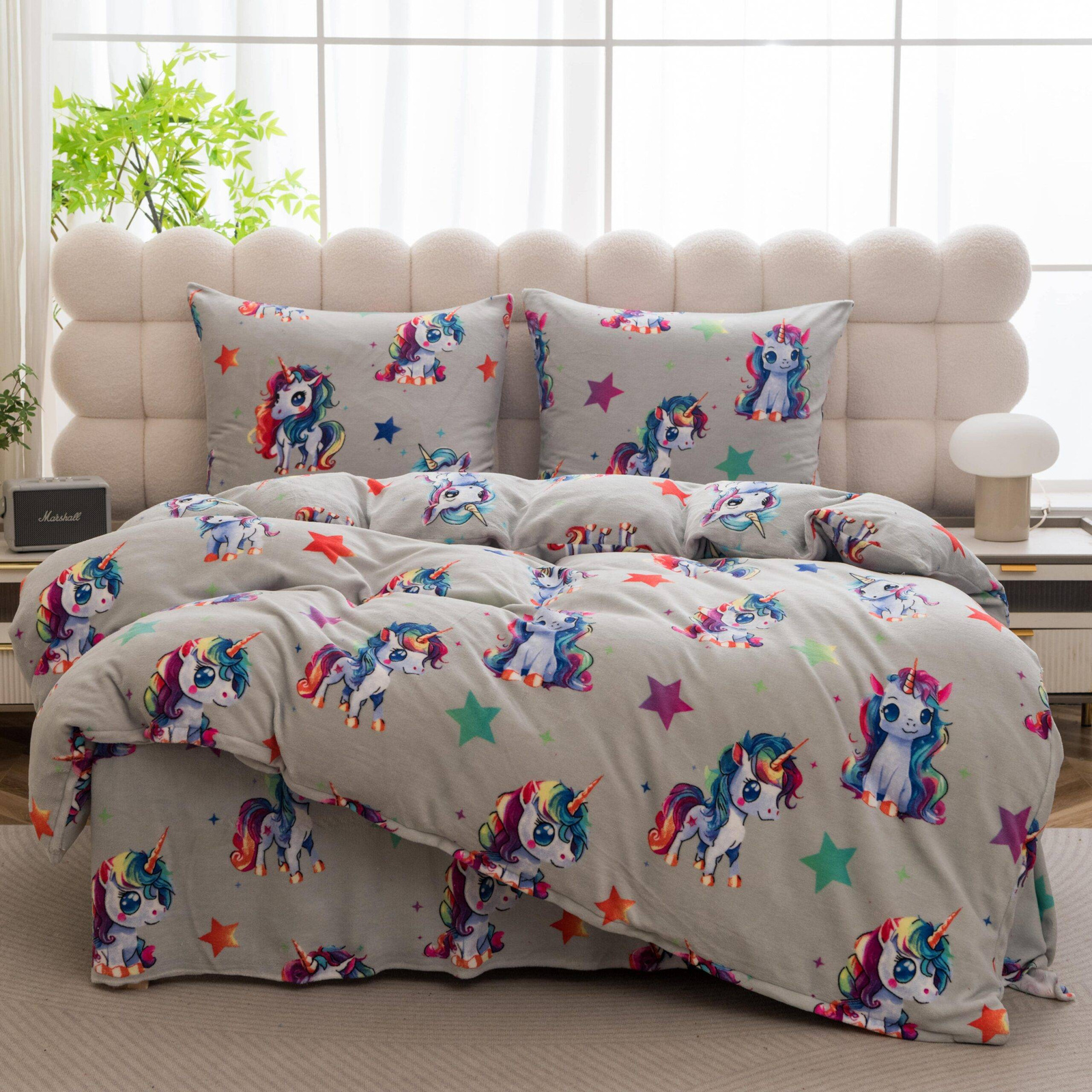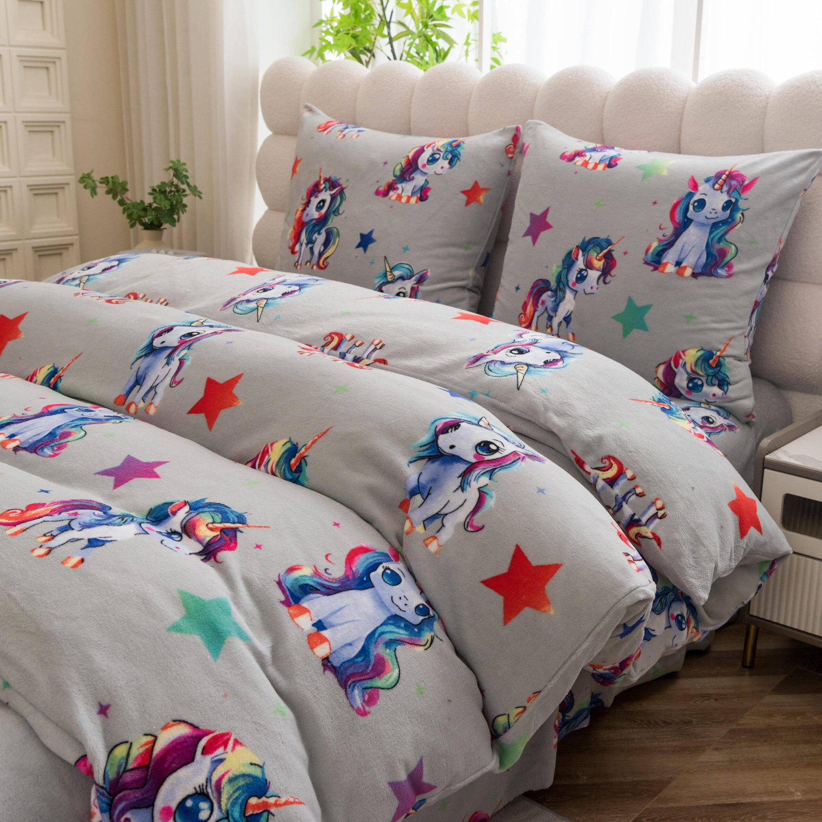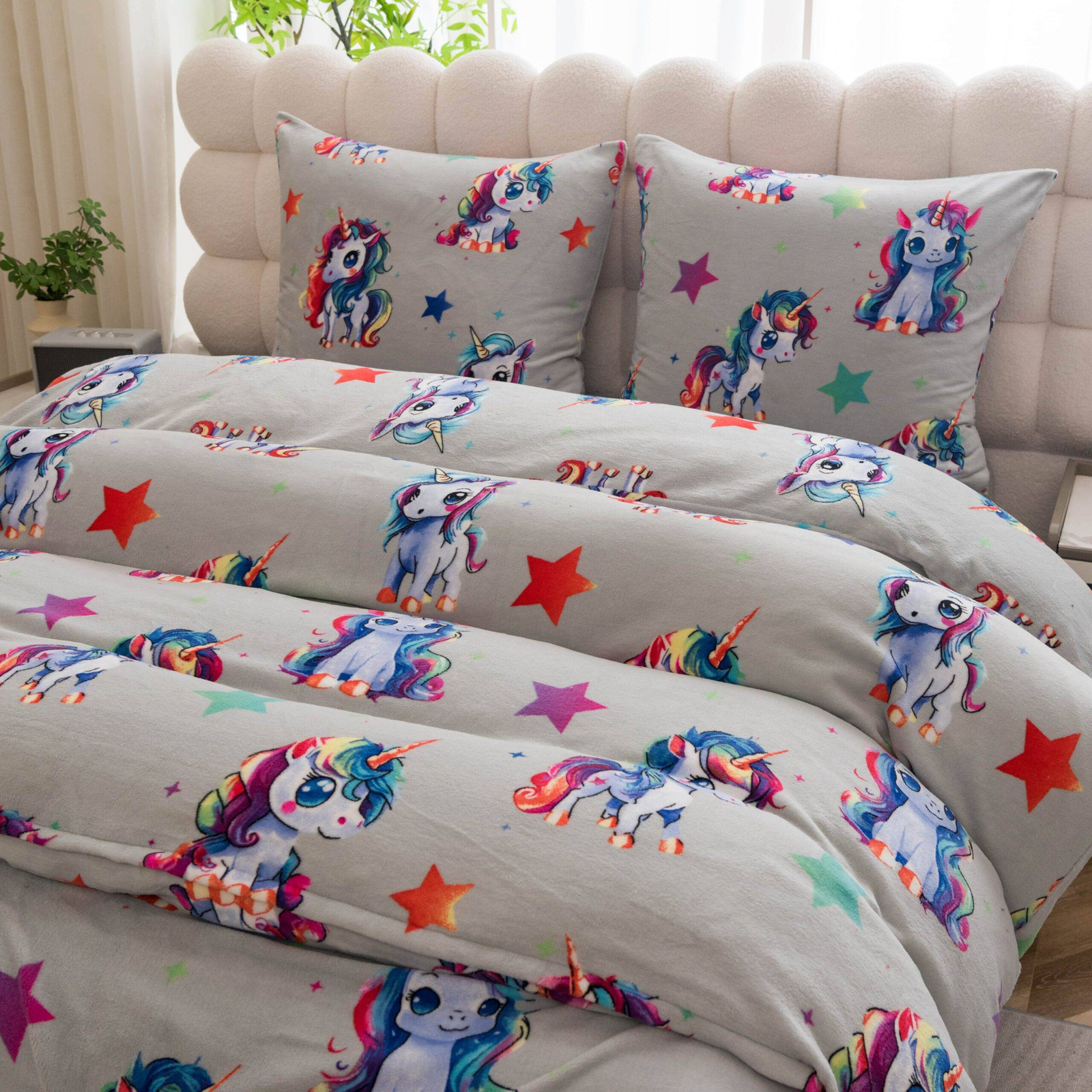 - Komplet pościeli ciepłej zimowej z pluszu, polarowa 160x200, dwustronna poszewka na kołdrę i 2 x poszewka na poduszkę 70x80, pościel w zwierzątka Unicorn, pościel dla dzieci, pościel dziecięca