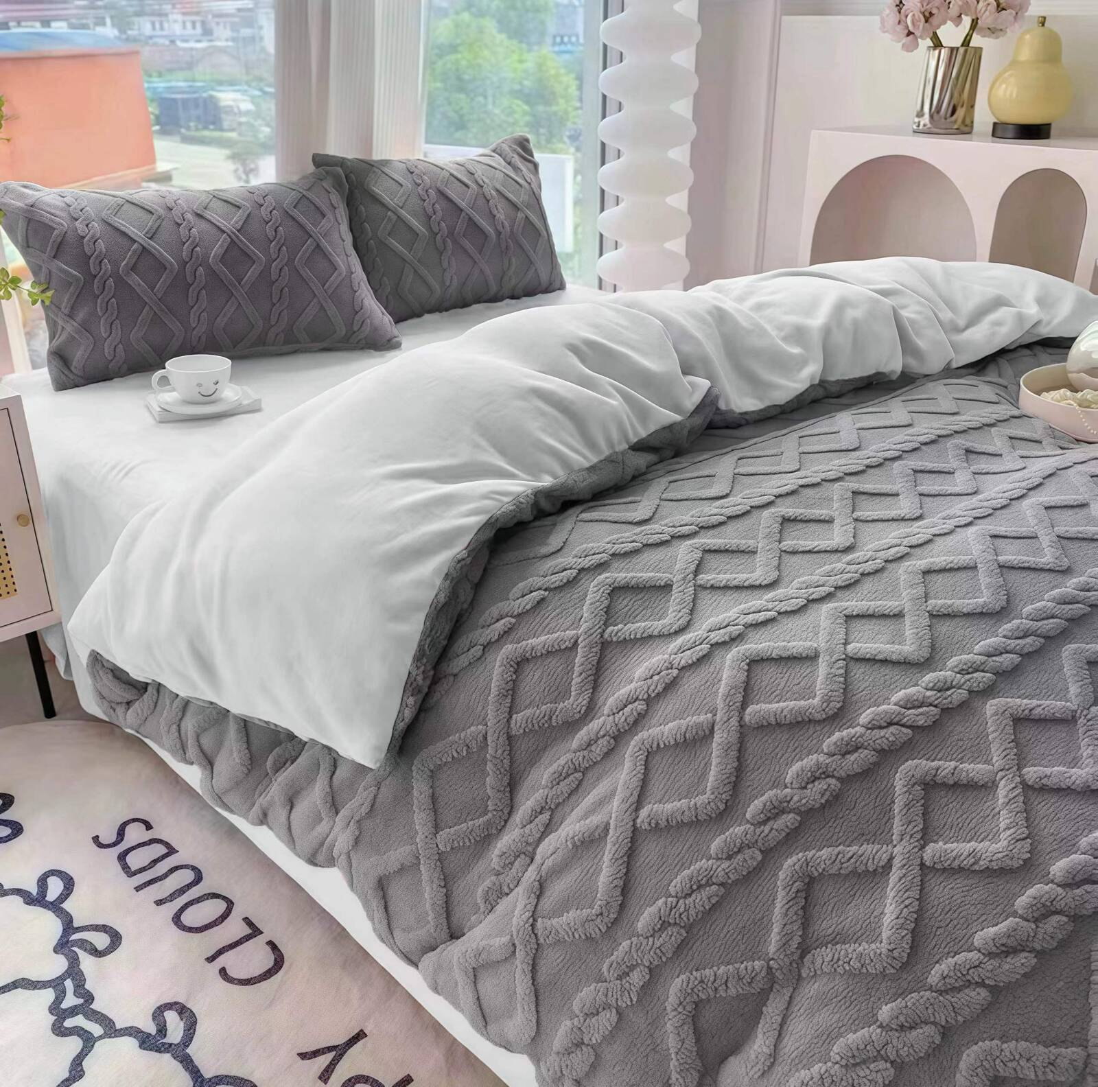 - Komplet pościeli ciepłej zimowej z pluszu, polarowa 160x200, dwustronna poszewka na kołdrę i 2 x poszewka na poduszkę 70x80, pościel ze wzorem 3D, sweterkowa, ciemna szara, jasna szara