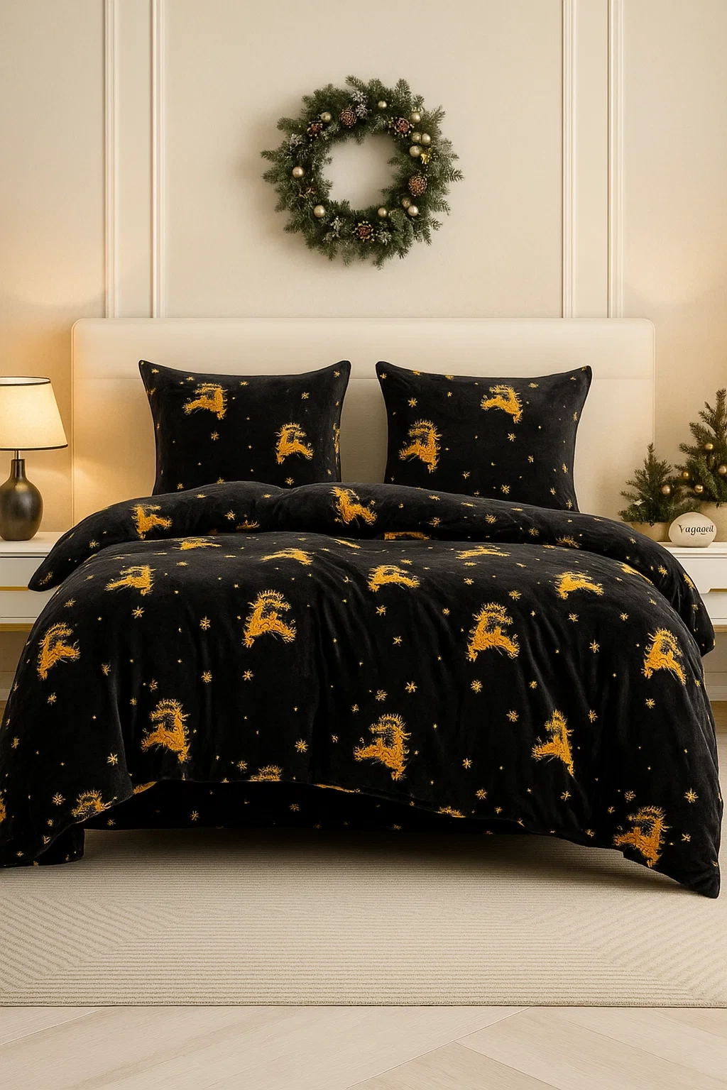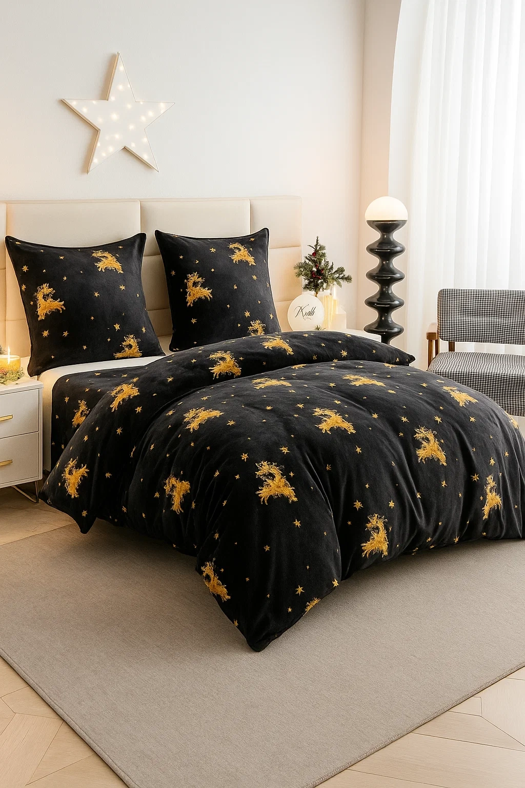 - Komplet pościeli ciepłej zimowej z pluszu, polarowa 160x200, dwustronna poszewka na kołdrę i 2 x poszewka na poduszkę 70x80, pościel z wzorem świątecznym, czarna z reniferami