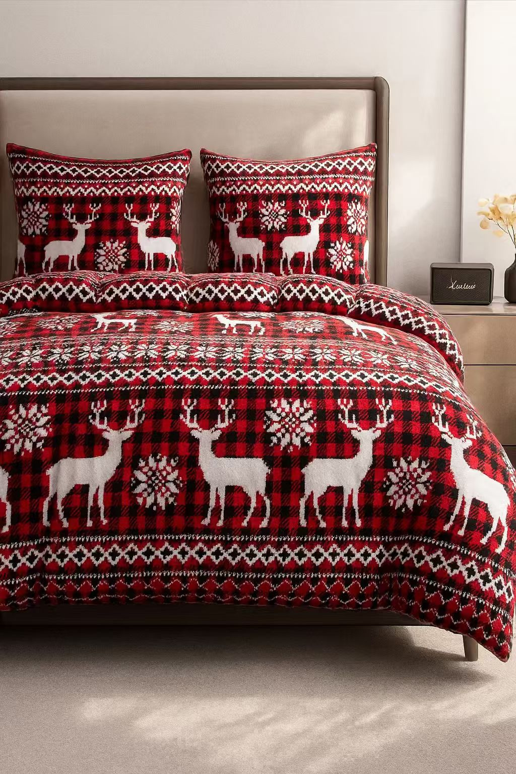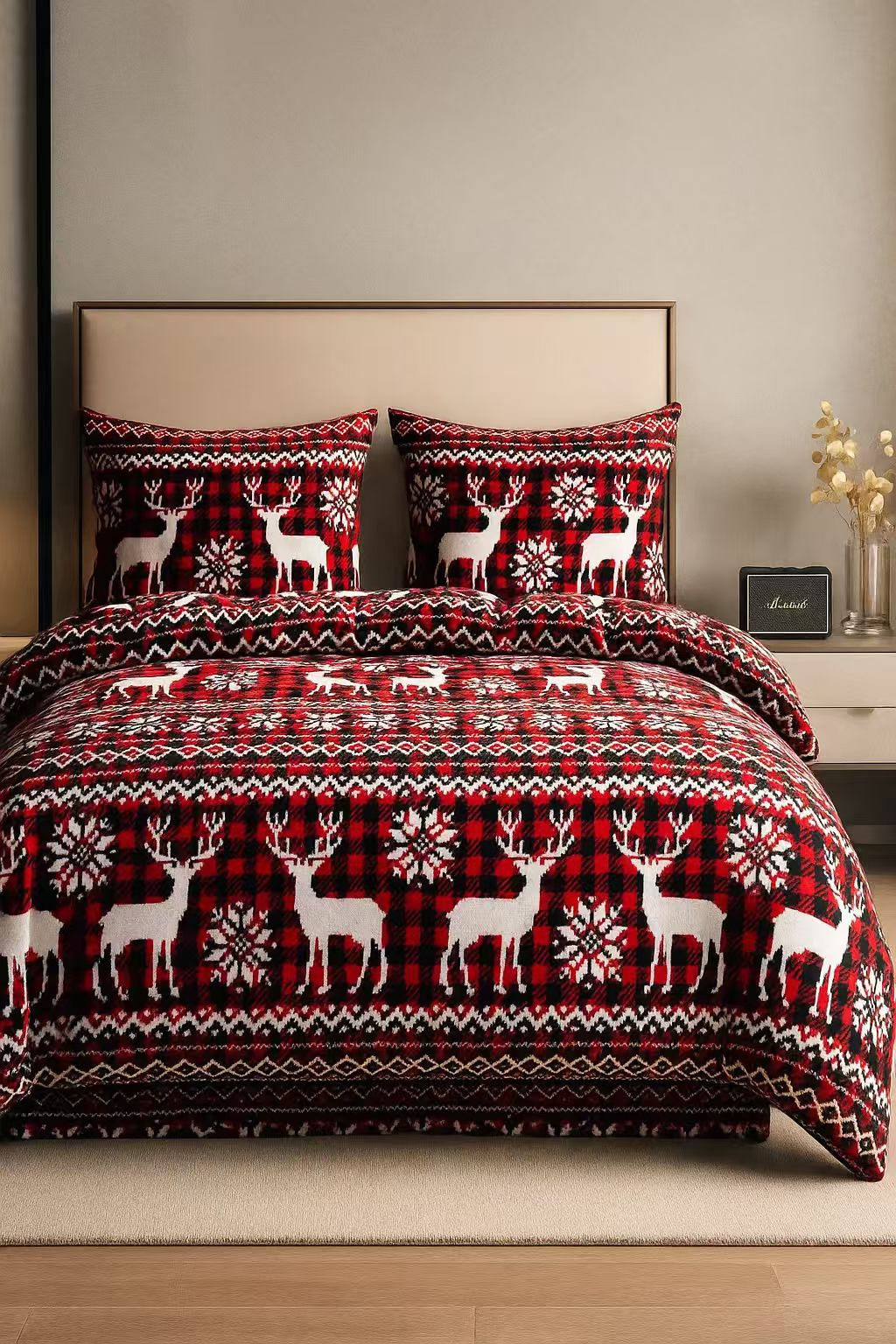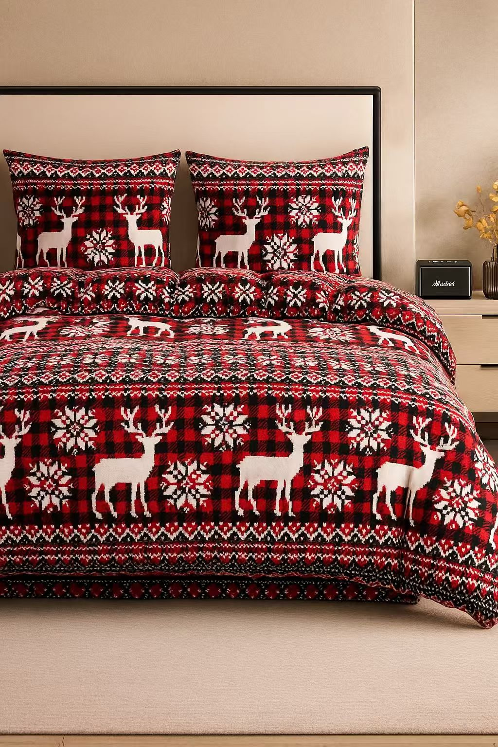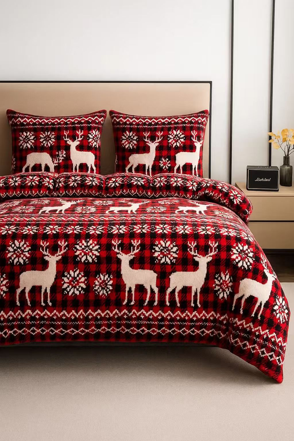 - Komplet pościeli ciepłej zimowej z pluszu, polarowa 160x200, dwustronna poszewka na kołdrę i 2 x poszewka na poduszkę 70x80, pościel ze wzorem świątecznym, czerwona z reniferami i pledową kratą