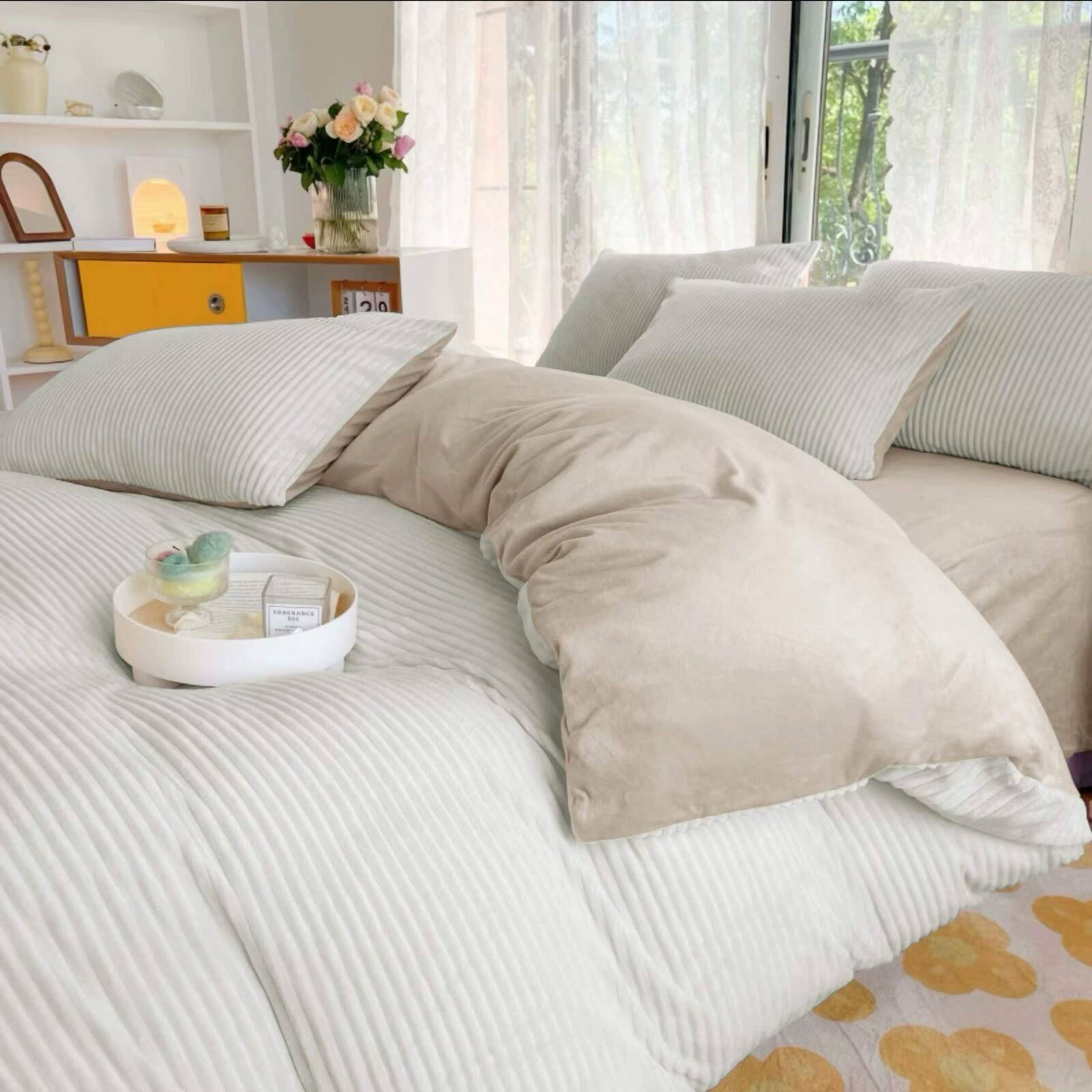 - Komplet pościeli ciepłej zimowej z pluszu, polarowa 160x200, dwustronna poszewka na kołdrę i 2 x poszewka na poduszkę 70x80, pościel w pasy, tłoczona, dwukolorowa, biała, beżowa