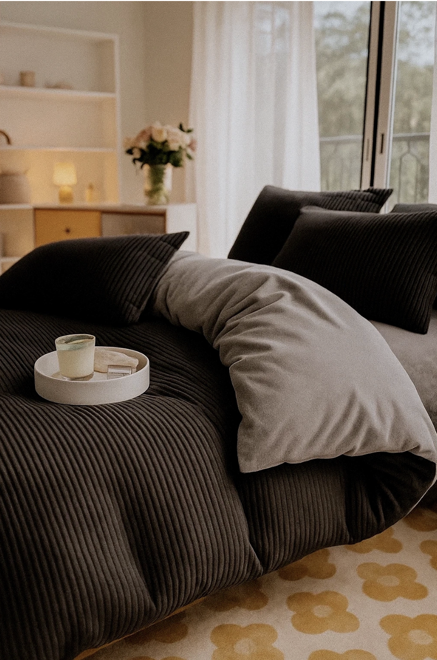 - Komplet pościeli ciepłej zimowej z pluszu, polarowa 200x220, dwustronna poszewka na kołdrę i 2 x poszewka na poduszkę 70x80, pościel w pasy, tłoczona, dwukolorowa, czarna, szara