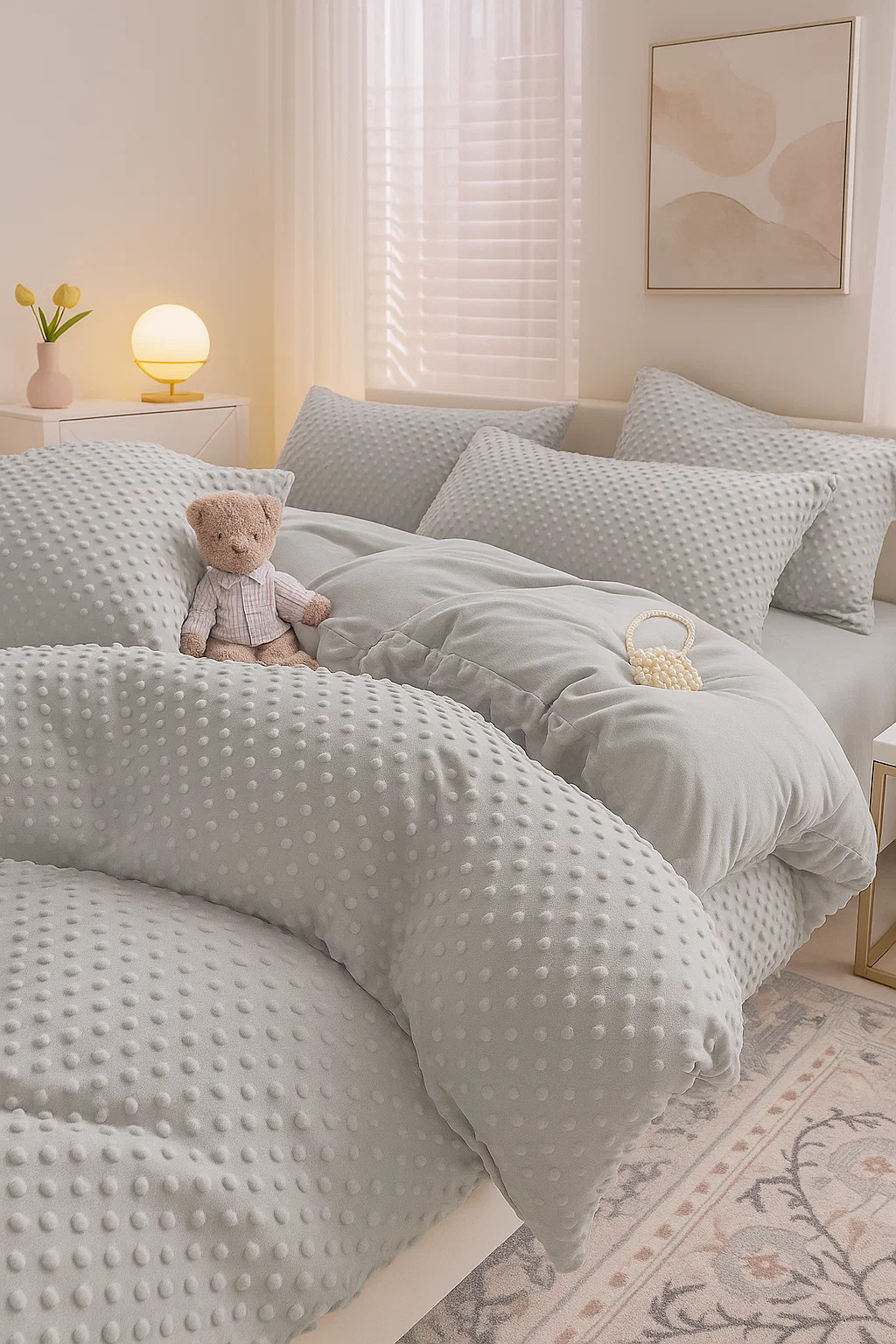 - Komplet pościeli ciepłej zimowej z pluszu, polarowa 140x200, dwustronna poszewka na kołdrę i 1 x poszewka na poduszkę 70x80, pościel ze zdobieniem 3D, w kropki, jasna szara