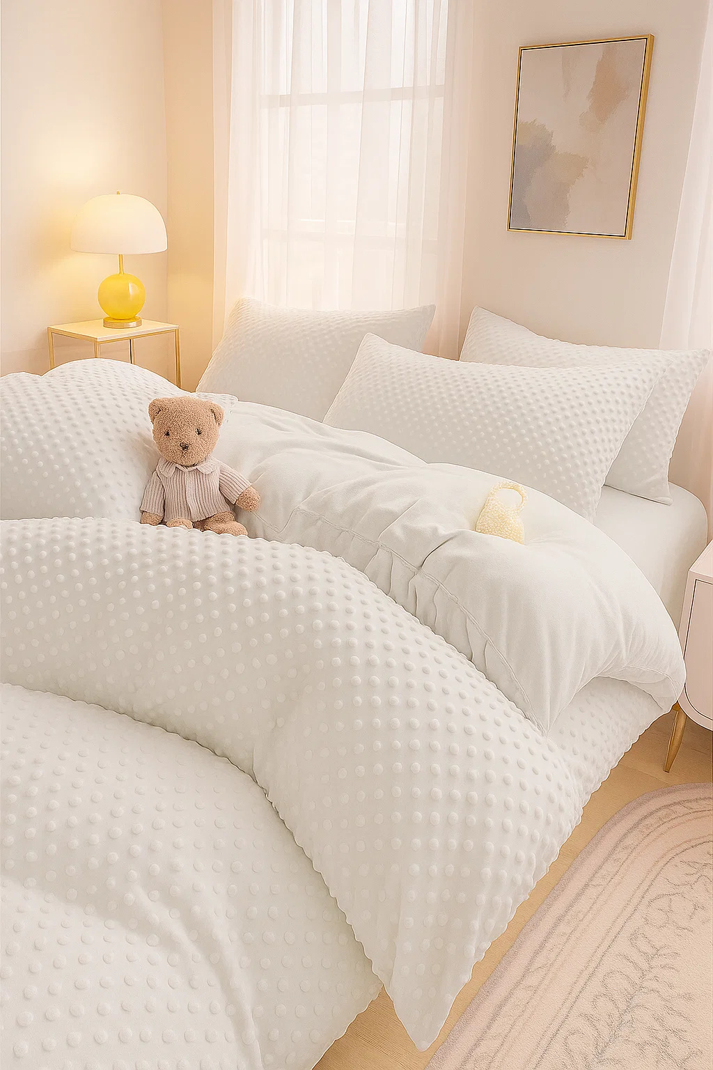 Komplet pościeli wykonany z pluszu (mikrowłókno). Jest to materiał, który nie wymaga prasowania, dzięki czemu pranie i zmiana pościeli staje się przyjemnością. Ciepły pluszowy materiał zapewnia odpowiedni komfort w zimowe noce, doskonale ogrzewa i jest bardzo miły w dotyku. Posiada jednolity kolor który nie traci intensywności, nawet po wielokrotnym praniu. Stylowe wielowymiarowe zdobienia w kropki dodają jej wyjątkowego charakteru.