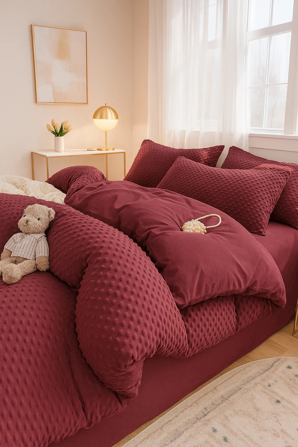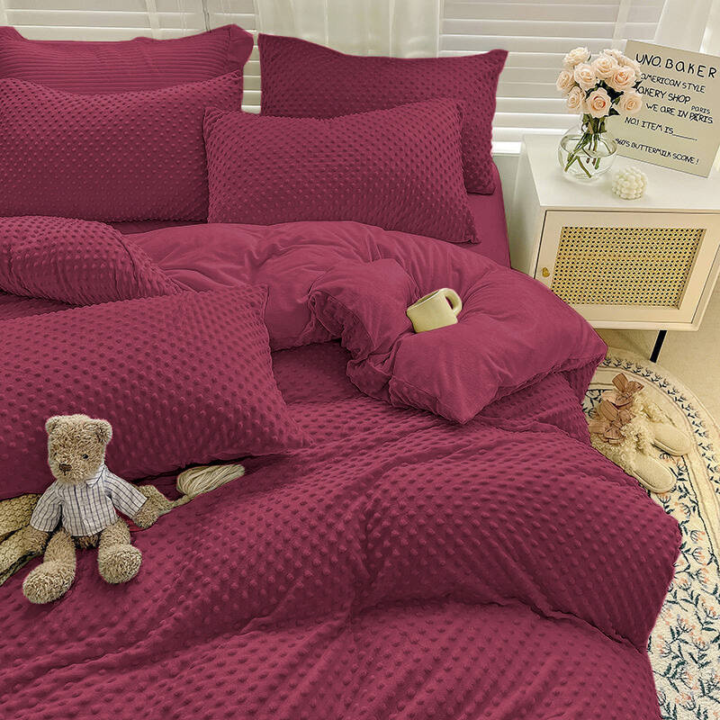 - Komplet pościeli ciepłej zimowej z pluszu, polarowa 160x200, dwustronna poszewka na kołdrę i 2 x poszewka na poduszkę 70x80, pościel ze zdobieniem 3D, w kropki, bordowa
