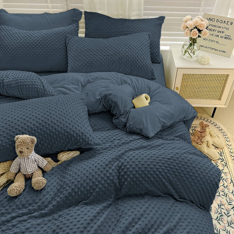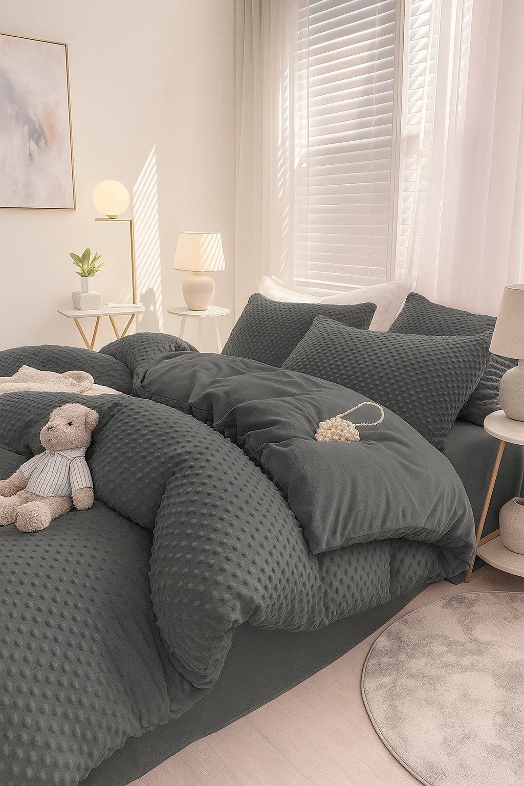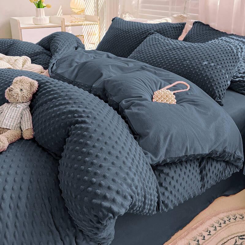 Komplet pościeli wykonany z pluszu (mikrowłókno). Jest to materiał, który nie wymaga prasowania, dzięki czemu pranie i zmiana pościeli staje się przyjemnością. Ciepły pluszowy materiał zapewnia odpowiedni komfort w zimowe noce, doskonale ogrzewa i jest bardzo miły w dotyku. Posiada jednolity kolor który nie traci intensywności, nawet po wielokrotnym praniu. Stylowe wielowymiarowe zdobienia w kropki dodają jej wyjątkowego charakteru.
