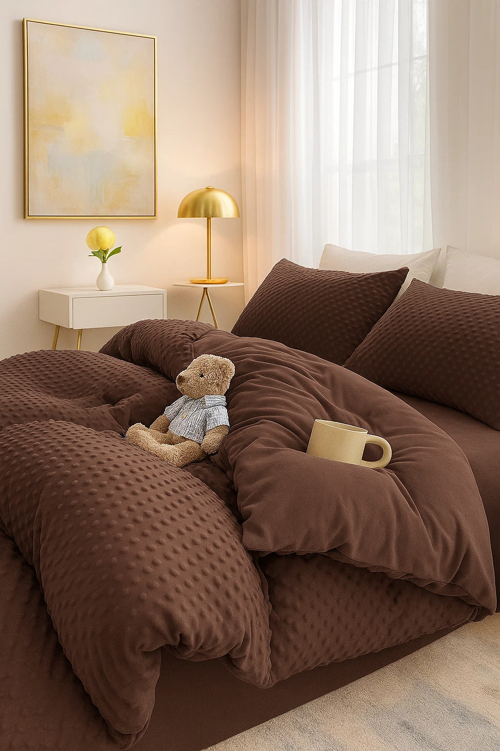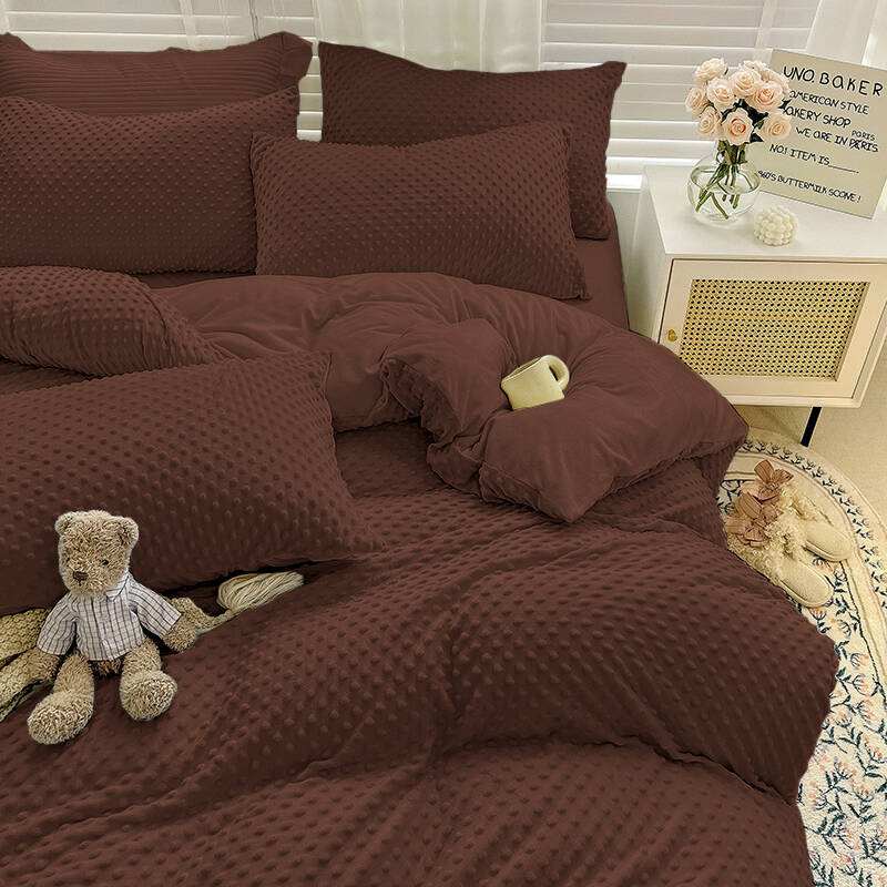 • Komplet pościeli ciepłej zimowej z pluszu, 200x220 polarowa, dwustronna poszewka na kołdrę i 2 x poszewka na poduszkę 70x80, pościel ze zdobieniem 3D, w kropki, brązowa