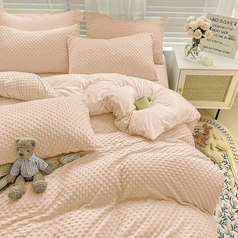 Komplet pościeli wykonany z pluszu (mikrowłókno). Jest to materiał, który nie wymaga prasowania, dzięki czemu pranie i zmiana pościeli staje się przyjemnością. Ciepły pluszowy materiał zapewnia odpowiedni komfort w zimowe noce, doskonale ogrzewa i jest bardzo miły w dotyku. Posiada jednolity kolor który nie traci intensywności, nawet po wielokrotnym praniu. Stylowe wielowymiarowe zdobienia w kropki dodają jej wyjątkowego charakteru.