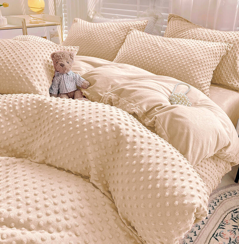 - Komplet pościeli ciepłej zimowej z pluszu, polarowa 200x220, dwustronna poszewka na kołdrę i 2 x poszewka na poduszkę 70x80, pościel ze zdobieniem 3D, w kropki, ciepła beżowa