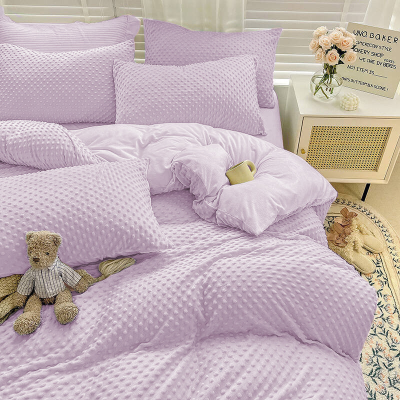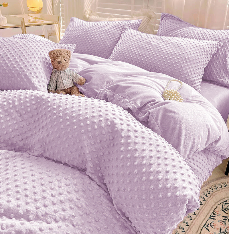 - Komplet pościeli ciepłej zimowej z pluszu, polarowa 200x220, dwustronna poszewka na kołdrę i 2 x poszewka na poduszkę 70x80, pościel ze zdobieniem 3D, w kropki, jasna fioletowa, lawendowa