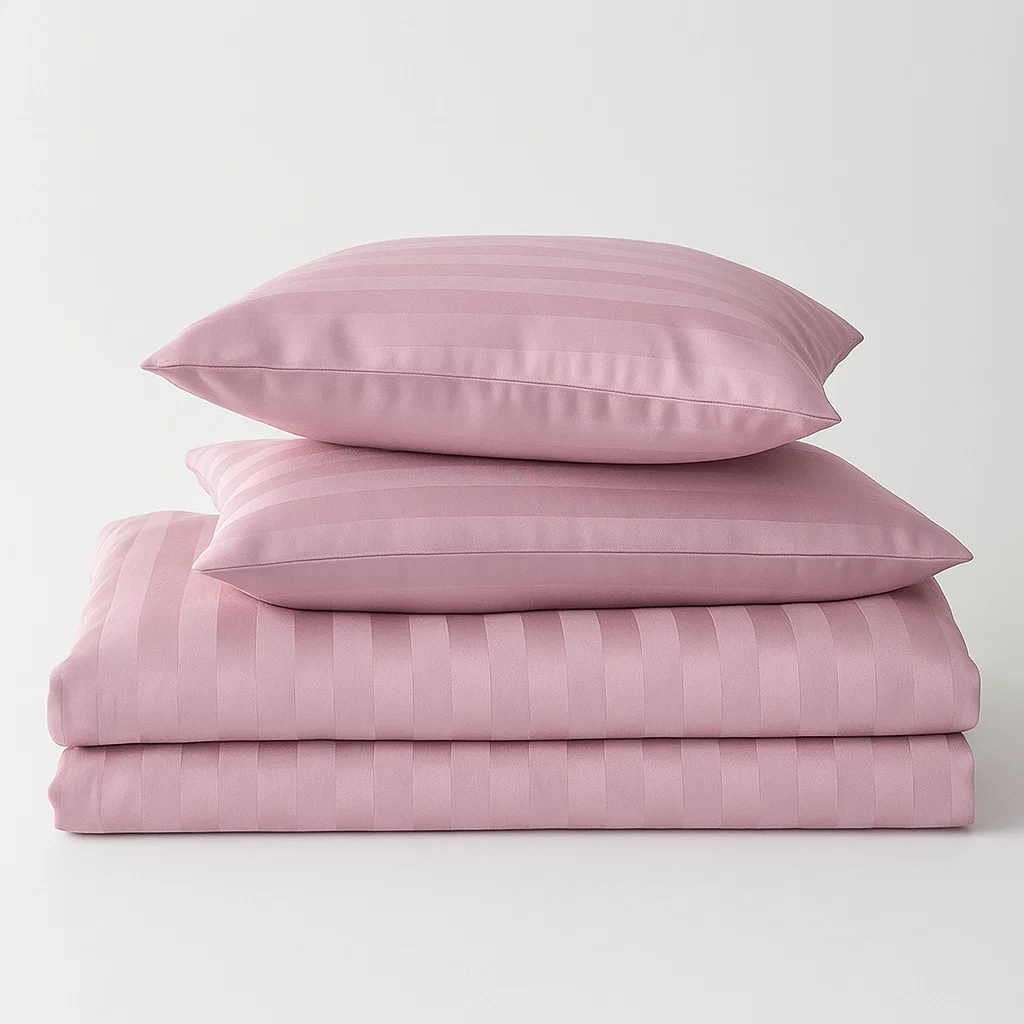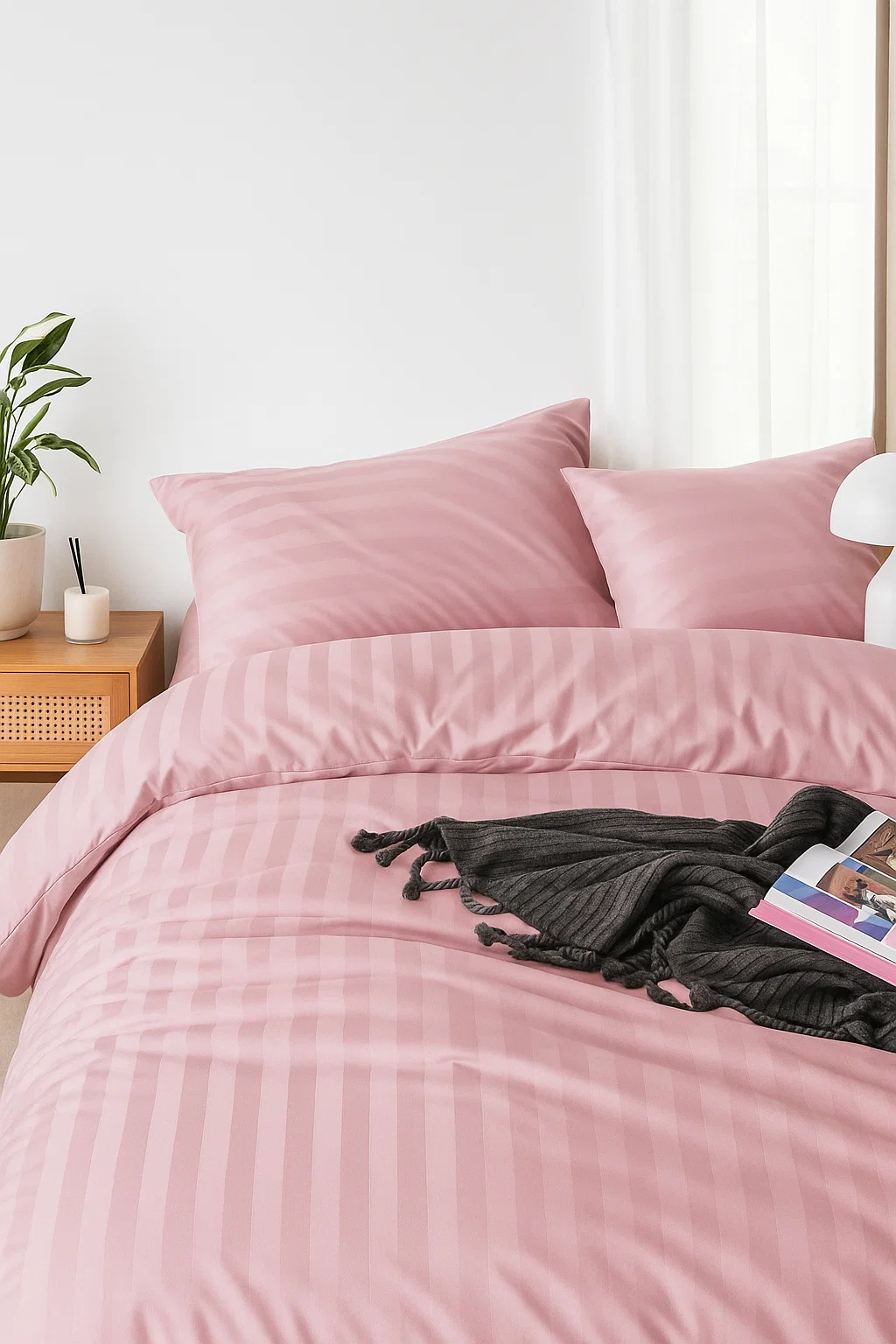 • Komplet różowej pościeli 200x220 skład: 100% bawełna syntetyczna, dwustronna poszewka na kołdrę, 2x poszewka na poduszkę 70x80, pościel w kolorze pudrowy róż w pasy, adamaszek