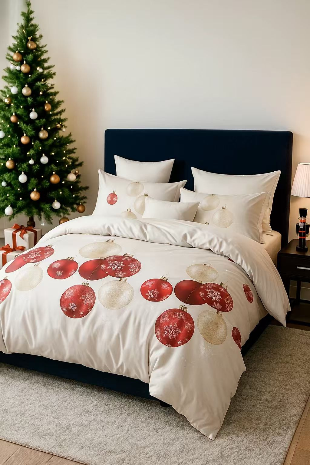 Pościel świąteczna biała w bombki 200x220 4 el. C-100