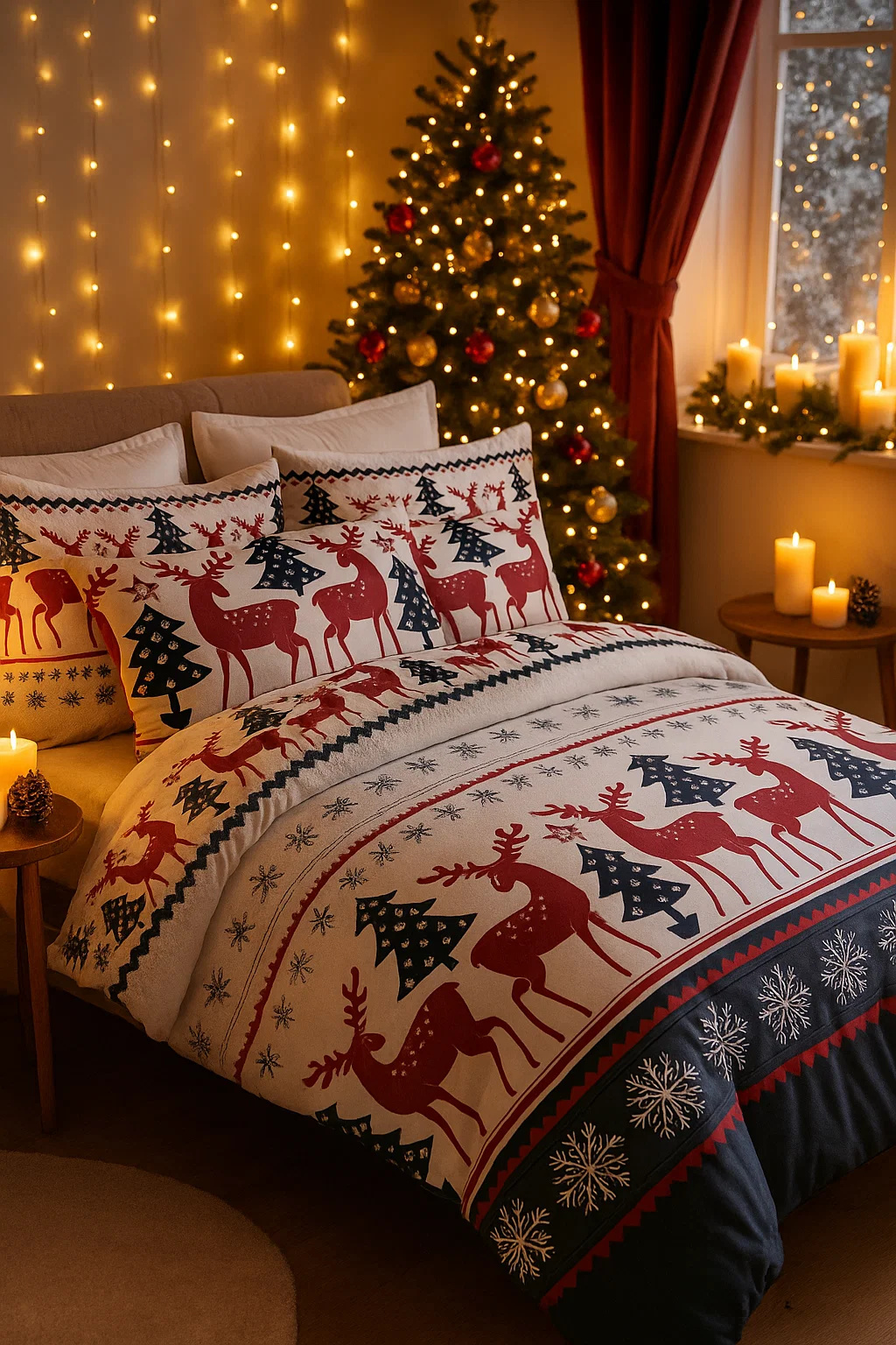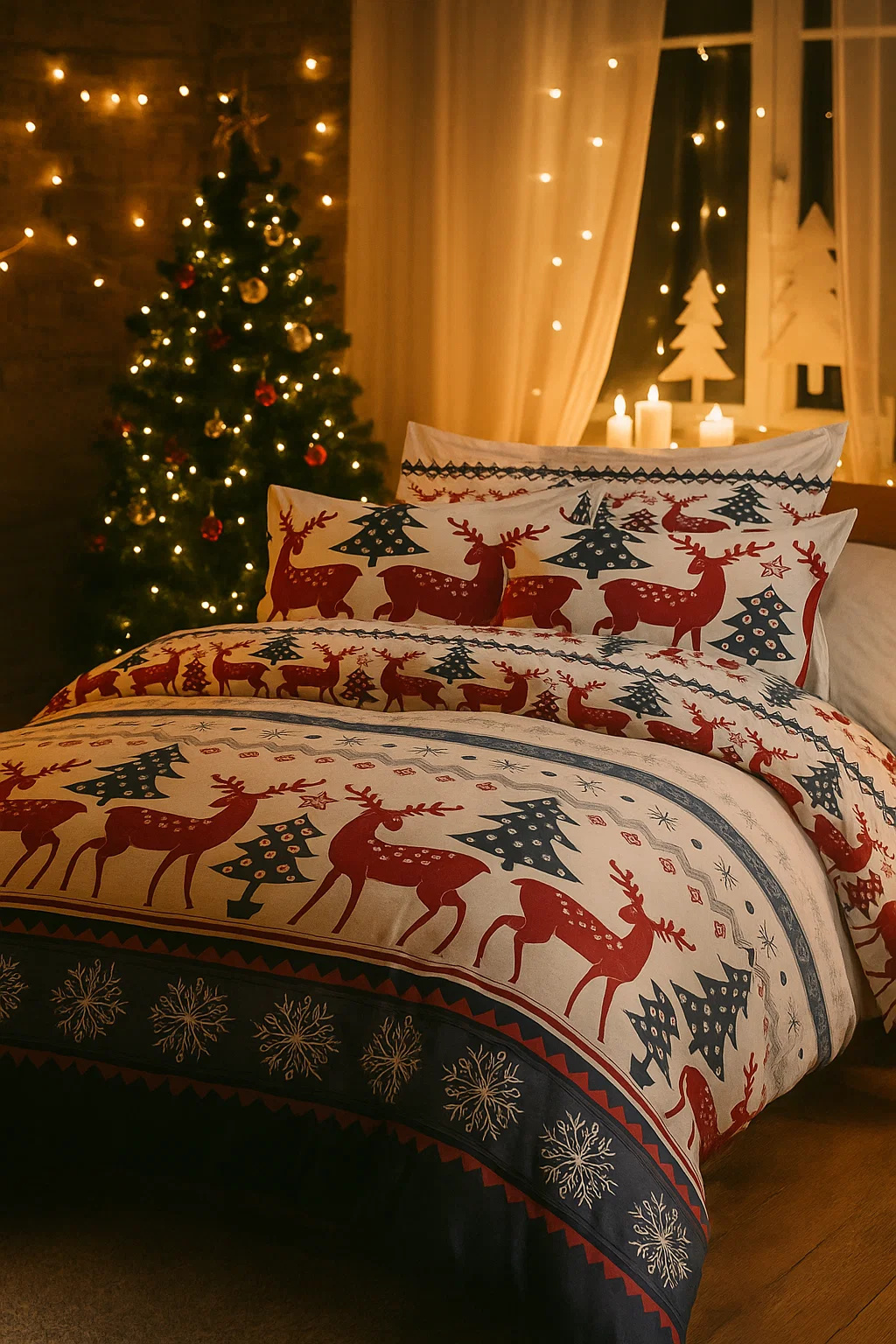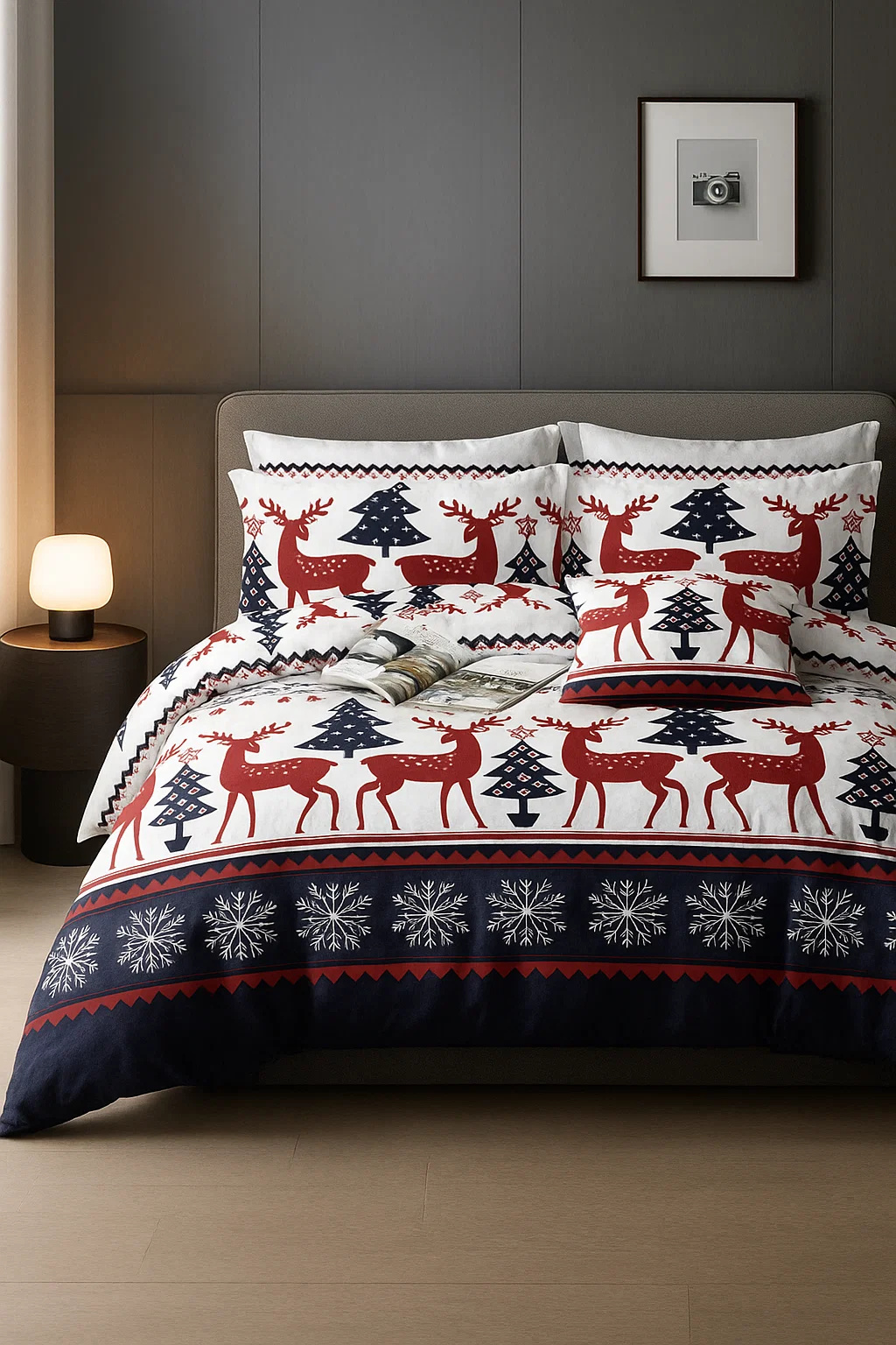 • Stylowa pościel świąteczna ze wzorami w renifery, choinki, śnieżynki, sweterek w kolorze białym, czerwonym, granatowym w rozmiarze 160x200 z prześcieradłem! Idealna na prezent na Boże Narodzenie, Gwiazdkę. Zapewnia świąteczny klimat w sypialni.