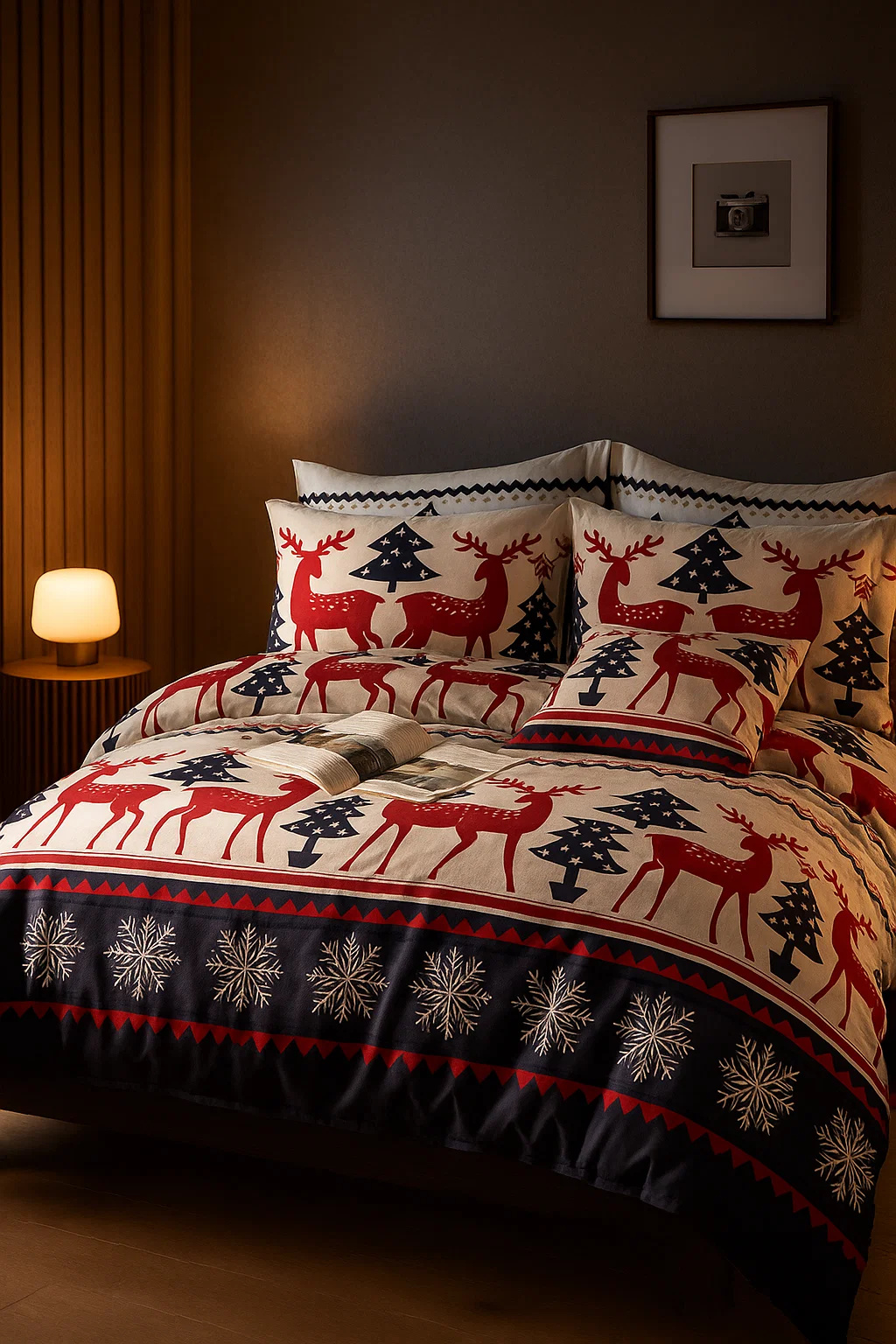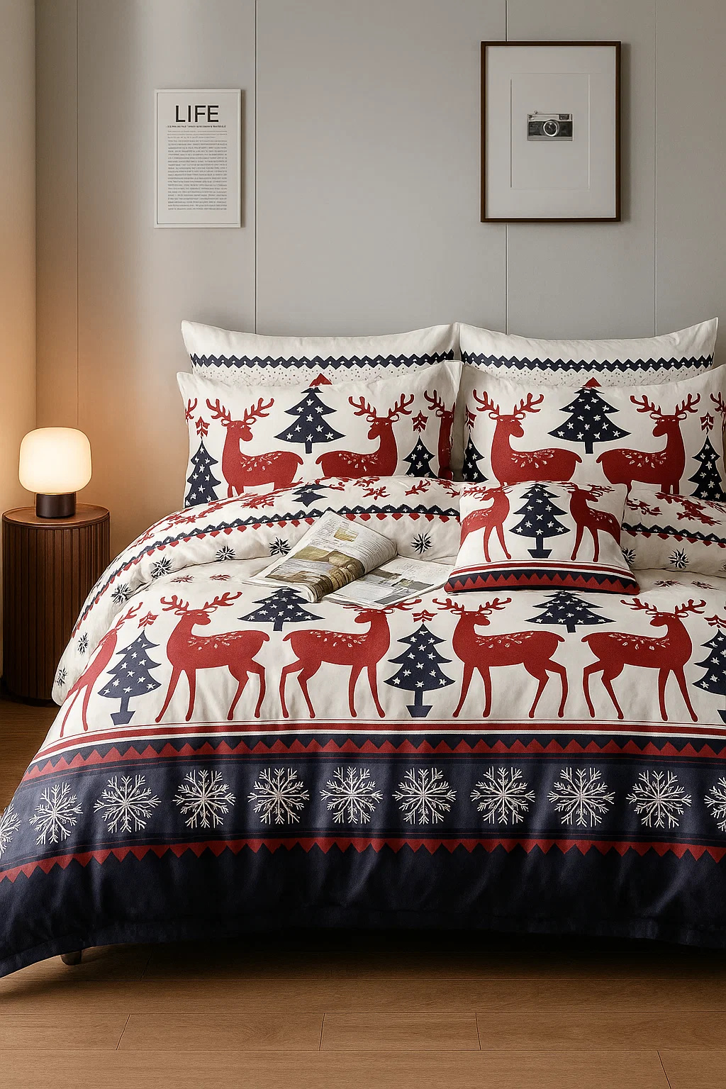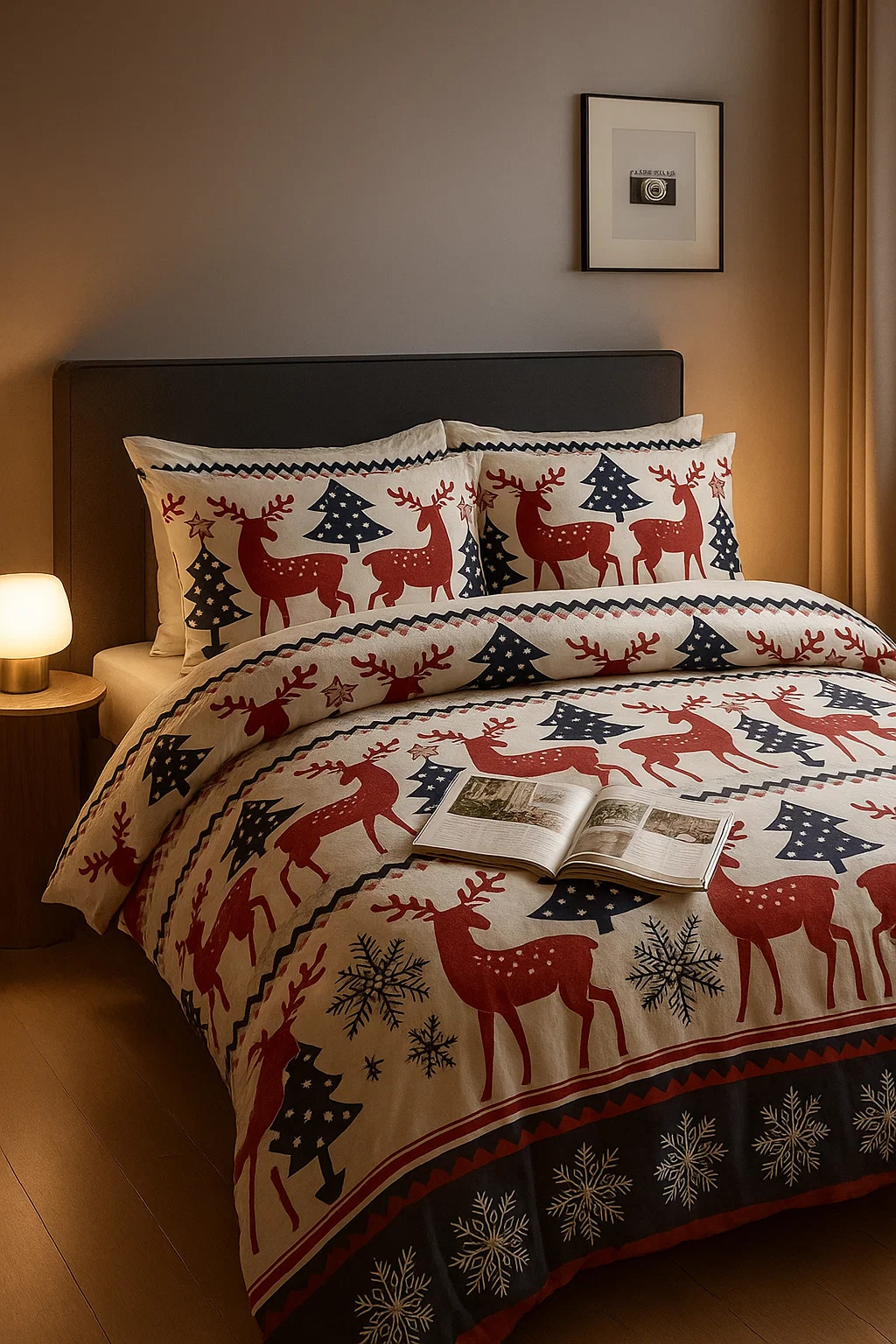 • Stylowa pościel świąteczna ze wzorami w renifery, choinki, śnieżynki, sweterek w kolorze białym, czerwonym, granatowym w rozmiarze 160x200 z prześcieradłem! Idealna na prezent na Boże Narodzenie, Gwiazdkę. Zapewnia świąteczny klimat w sypialni.