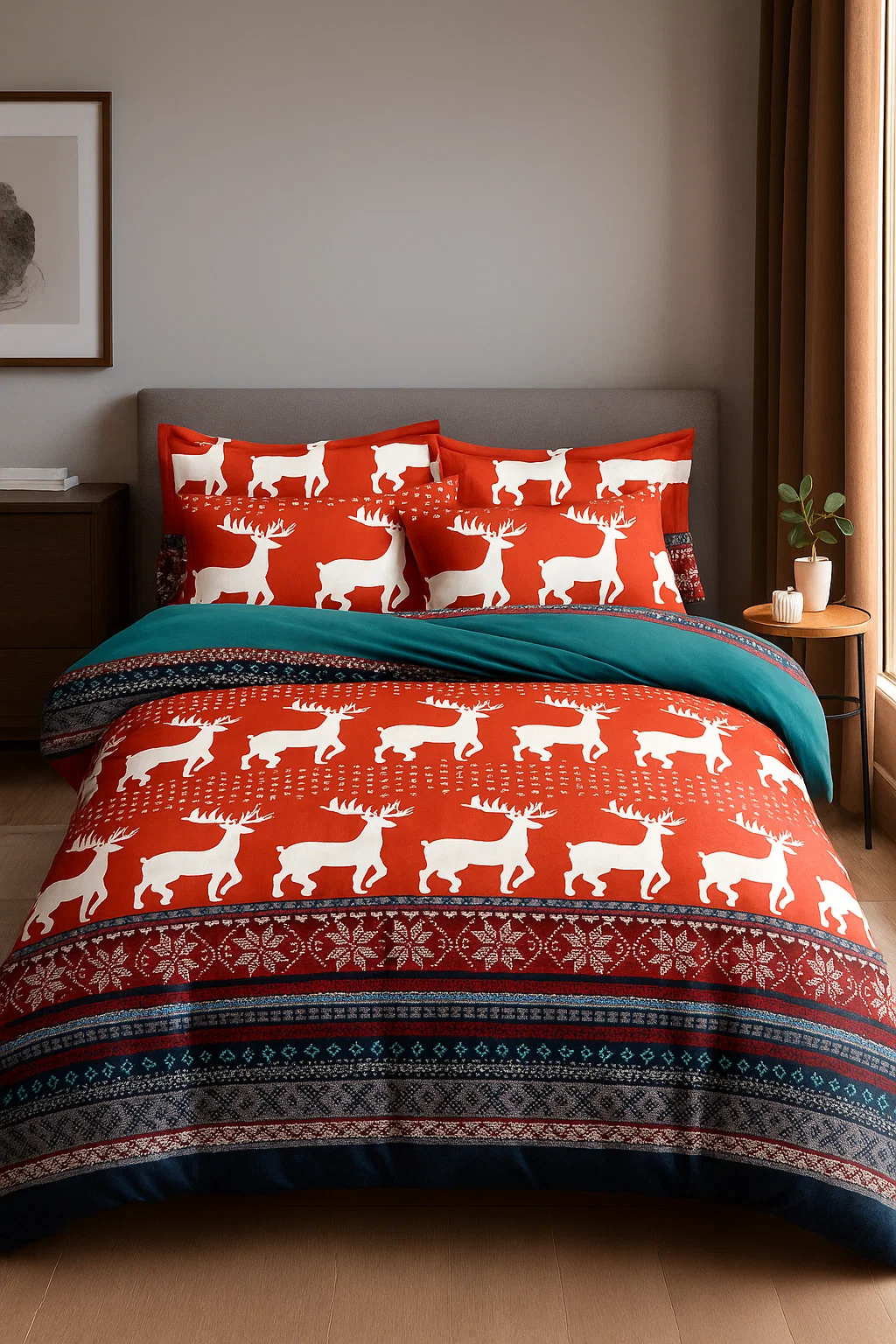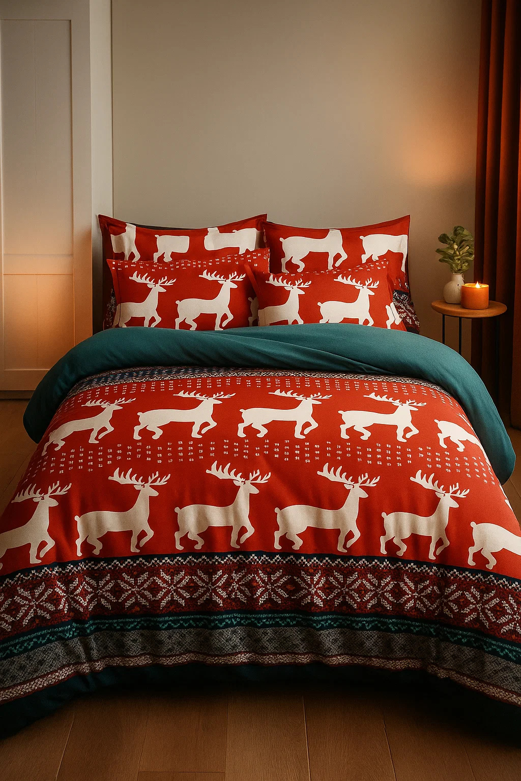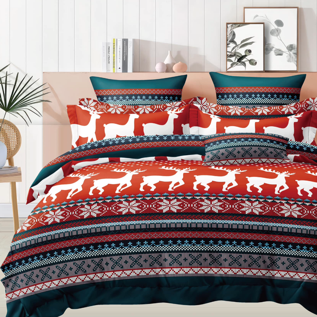 - Stylowa pościel świąteczna ze wzorami w renifery, śnieżynki, sweterek w kolorze czerwonym, zielonym, białym w rozmiarze 200x220! Idealna na prezent na Boże Narodzenie, Gwiazdkę. Zapewnia świąteczny klimat w sypialni.