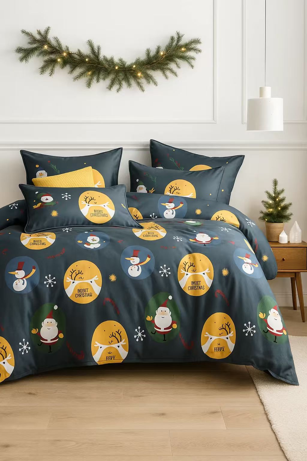 - Pościel z uroczymi motywami świątecznymi – Mikołaje, bałwanki i renifery na granatowym tle z żółtymi i niebieskimi kołami. Całość uzupełniają drobne płatki śniegu i napis Merry Christmas. Zimowa grafika wprowadza do sypialni świąteczny klimat.