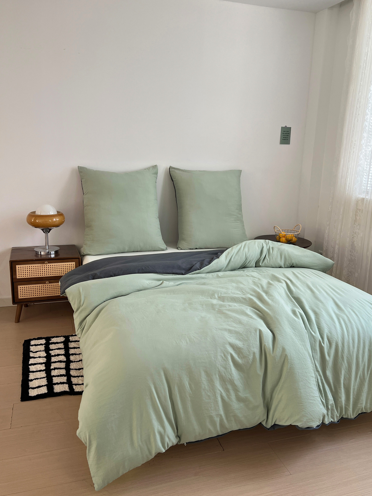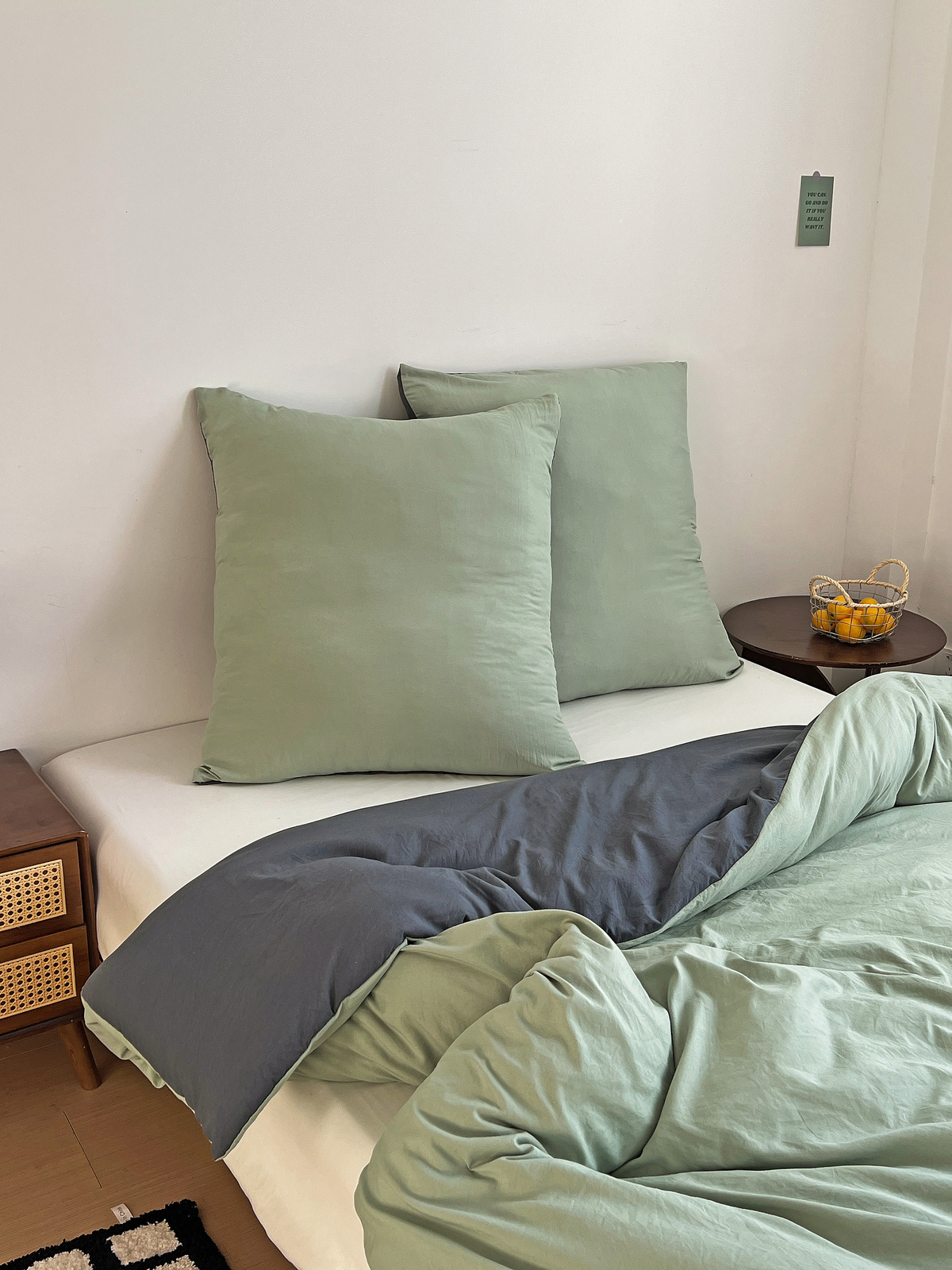 • Dwustronna pościel (sage green + dark grey)