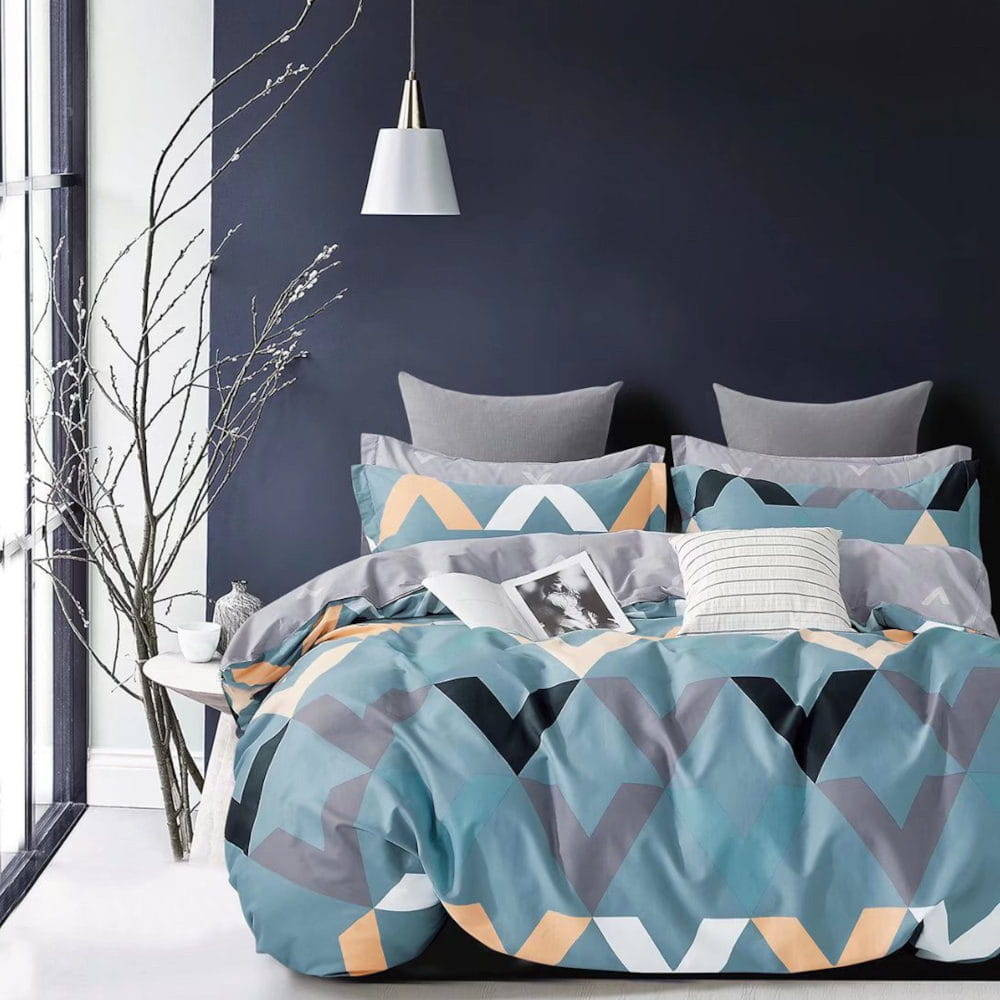 • Komplet pościeli bawełnianej syntetycznej w rozmiarze 160x200, pościel niebieska w geometryczne kształty + prześcieradło