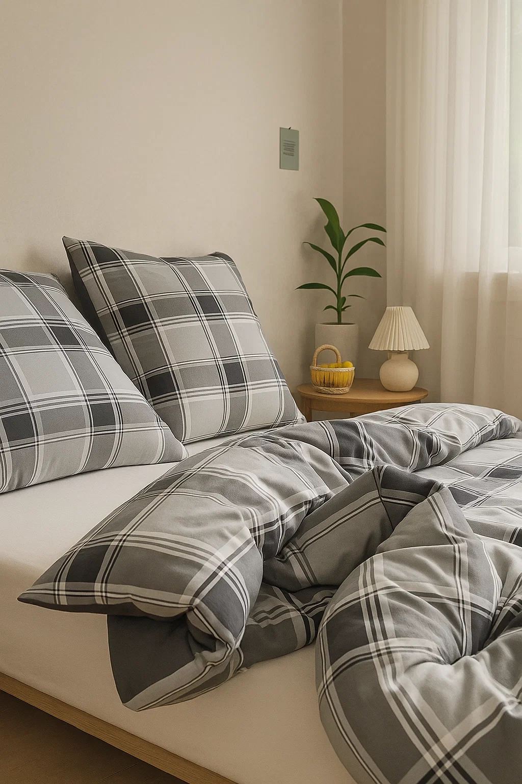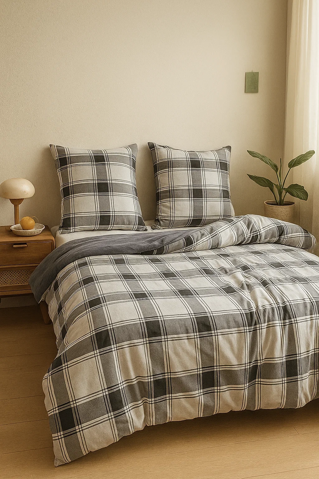Stonowana kolorystyka i ponadczasowa kratka sprawiają, że komplet świetnie komponuje się z wnętrzami w stylu: skandynawskim, minimalistycznym, naturalnym, japandi czy klasycznym.