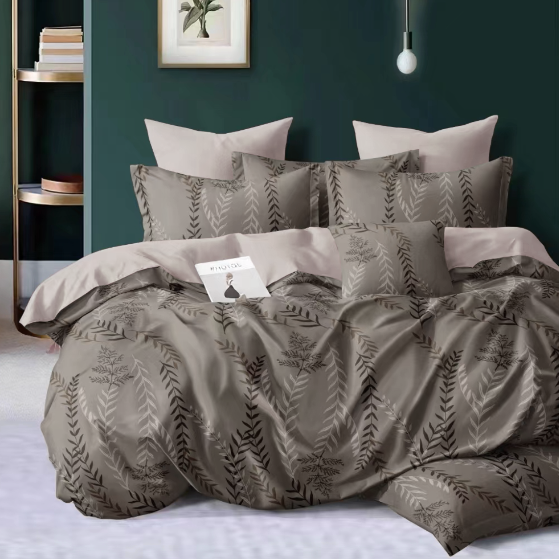 - Pościel w liście, ciemna szara, brązowa, beżowa
