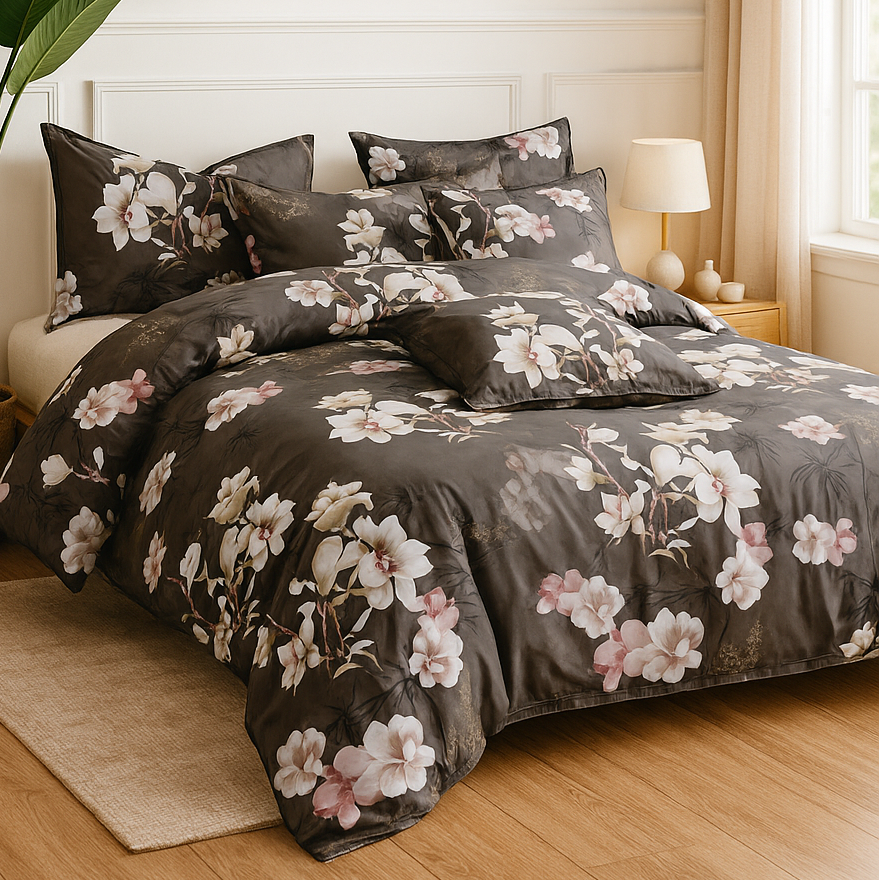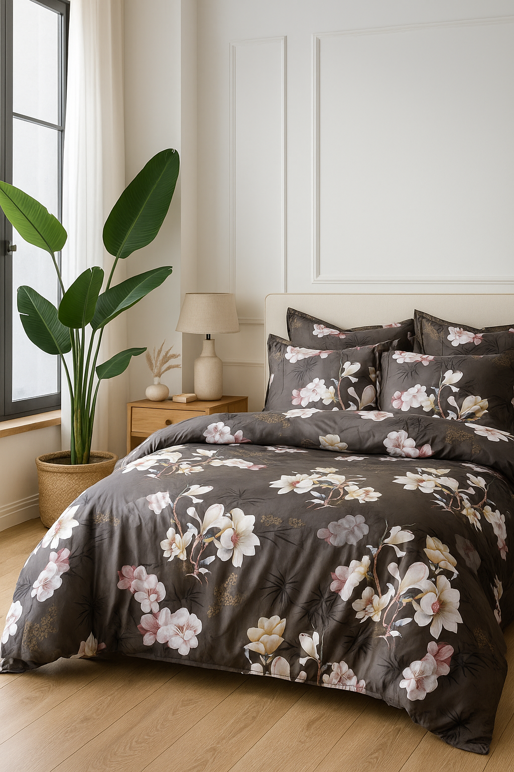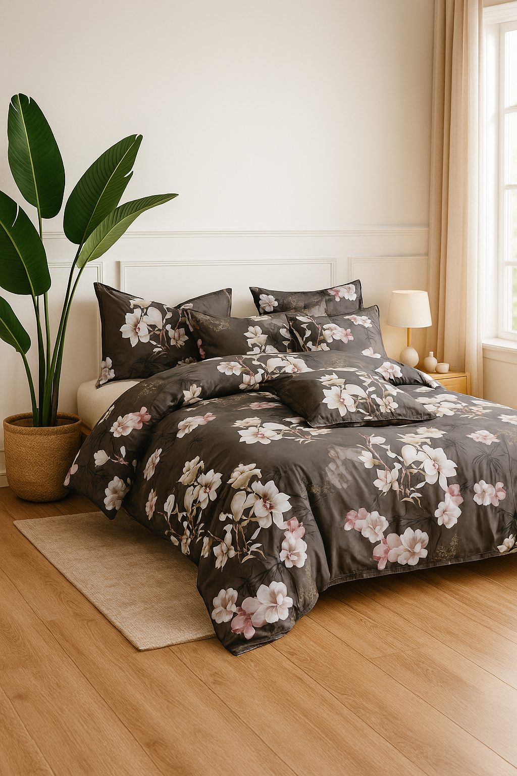 - Zestaw z dwoma poszewkami na poduszki, poszewką na kołdrę i z prześcieradłem. Stylowa pościel z wzorami w kwiatów. Komplet pościelowy w kwieciste wzory.