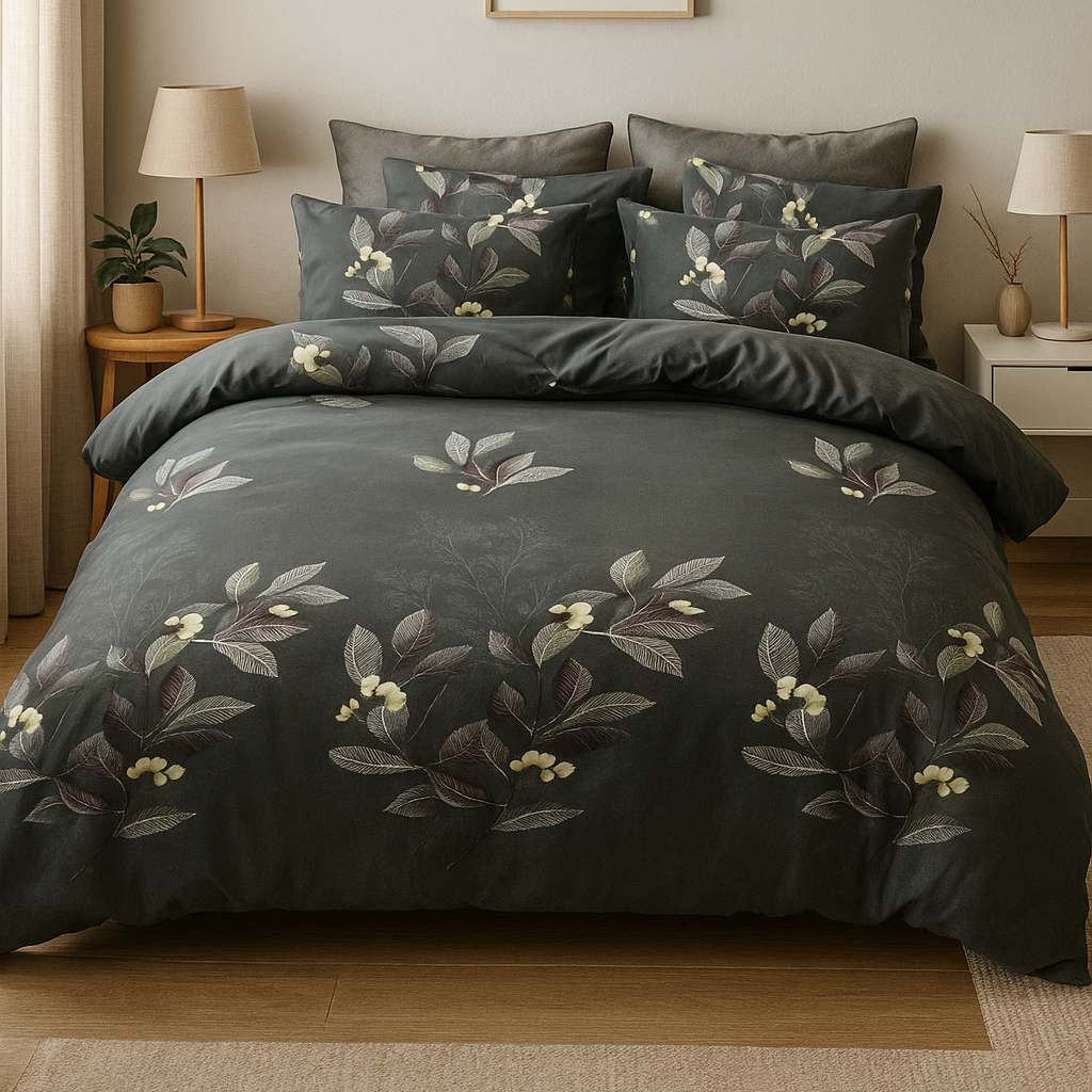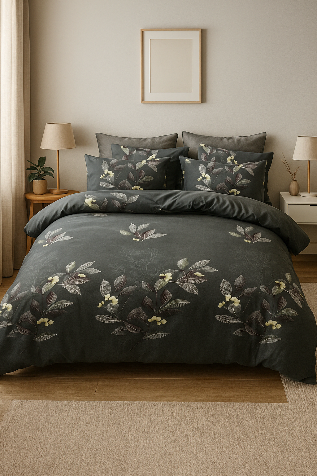 - Zestaw z dwoma poszewkami na poduszki, poszewką na kołdrę i z prześcieradłem. Stylowa pościel z wzorami w kwiatów. Komplet pościelowy w kwieciste wzory.