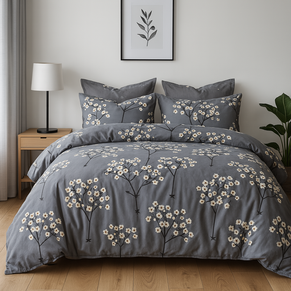 - Zestaw z dwiema poszewkami na poduszki, poszewką na kołdrę i z prześcieradłem. Stylowa pościel z wzorami kwiatów. Komplet pościelowy w kwieciste wzory.
